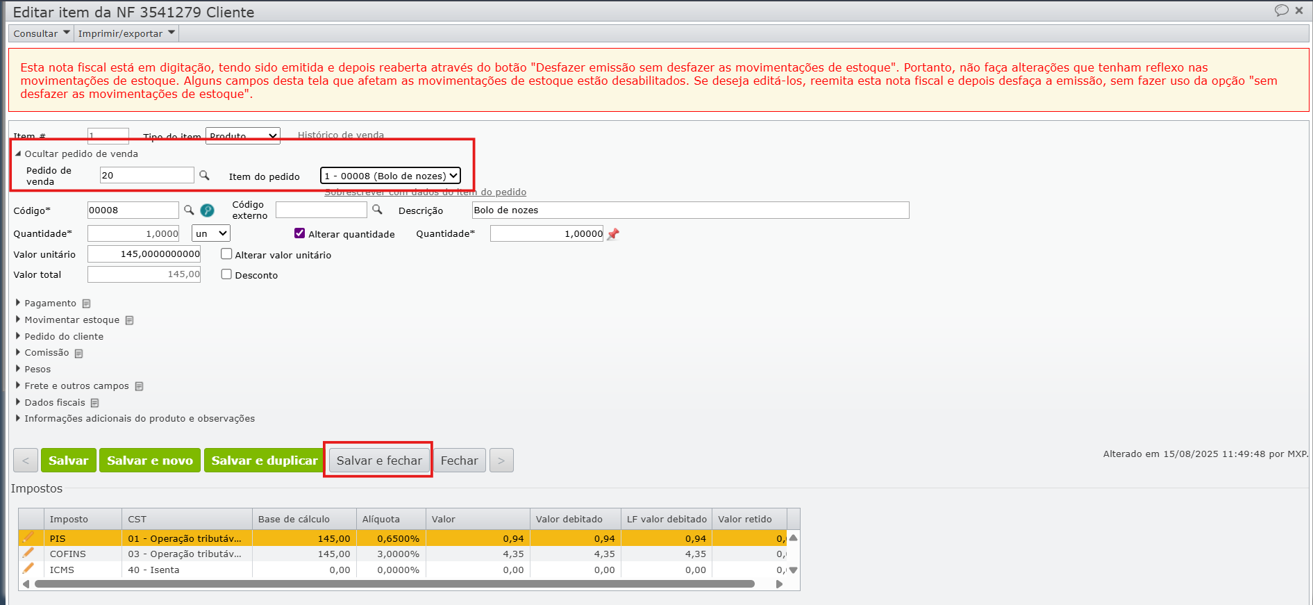 6) Preencha os campos “Pedido de venda” e “Item do pedido”. Clique em “Salvar e fechar” para gravar as alterações.