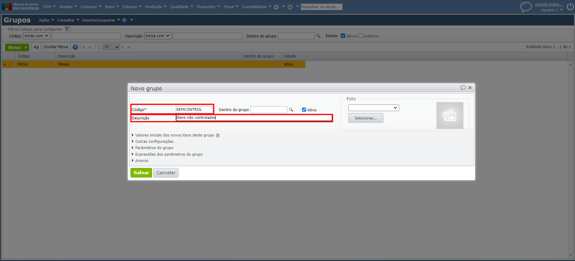 2) Informe um código para o grupo e, no campo “Descrição“, um texto com sua finalidade, tal como “Itens não controlados”.