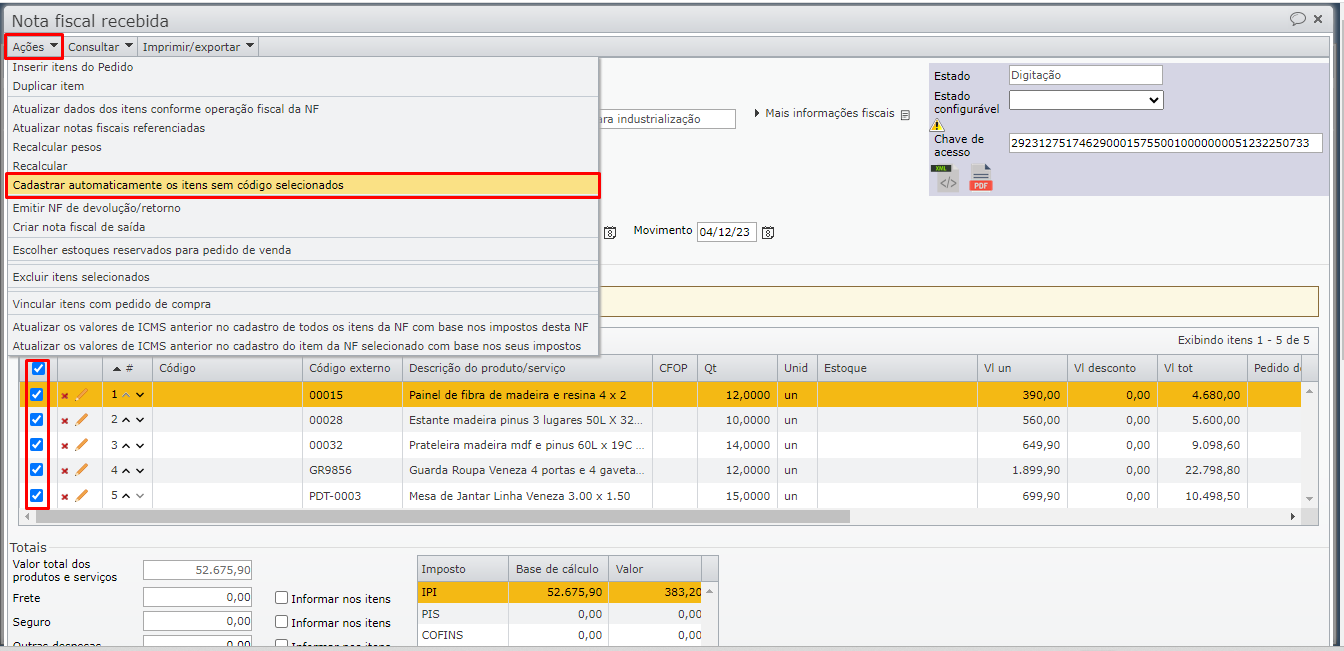 4) Ao importar uma NF com itens que não serão controlados, marque a caixa de seleção dos itens que que não tem código nem serão controlados, e cliqueo menu “Ações > Cadastrar automaticamente os itens sem código selecionados”.