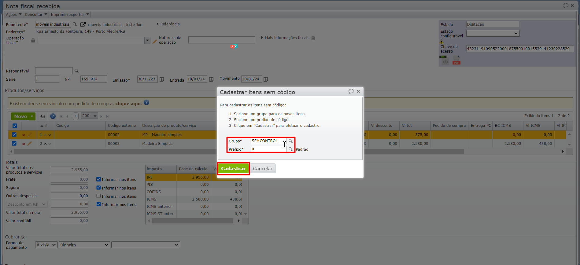 Às vezes é desejável receber do XML de uma Nota Fiscal (NF), sem previamente cadastrar seus itens, pois estes não requerem controle de estoque ou custos.