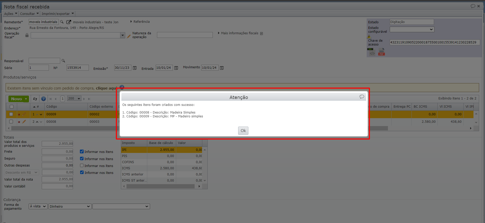 6) Ao final do processo será exibida uma mensagem, listando os itens cadastrados com sucesso.