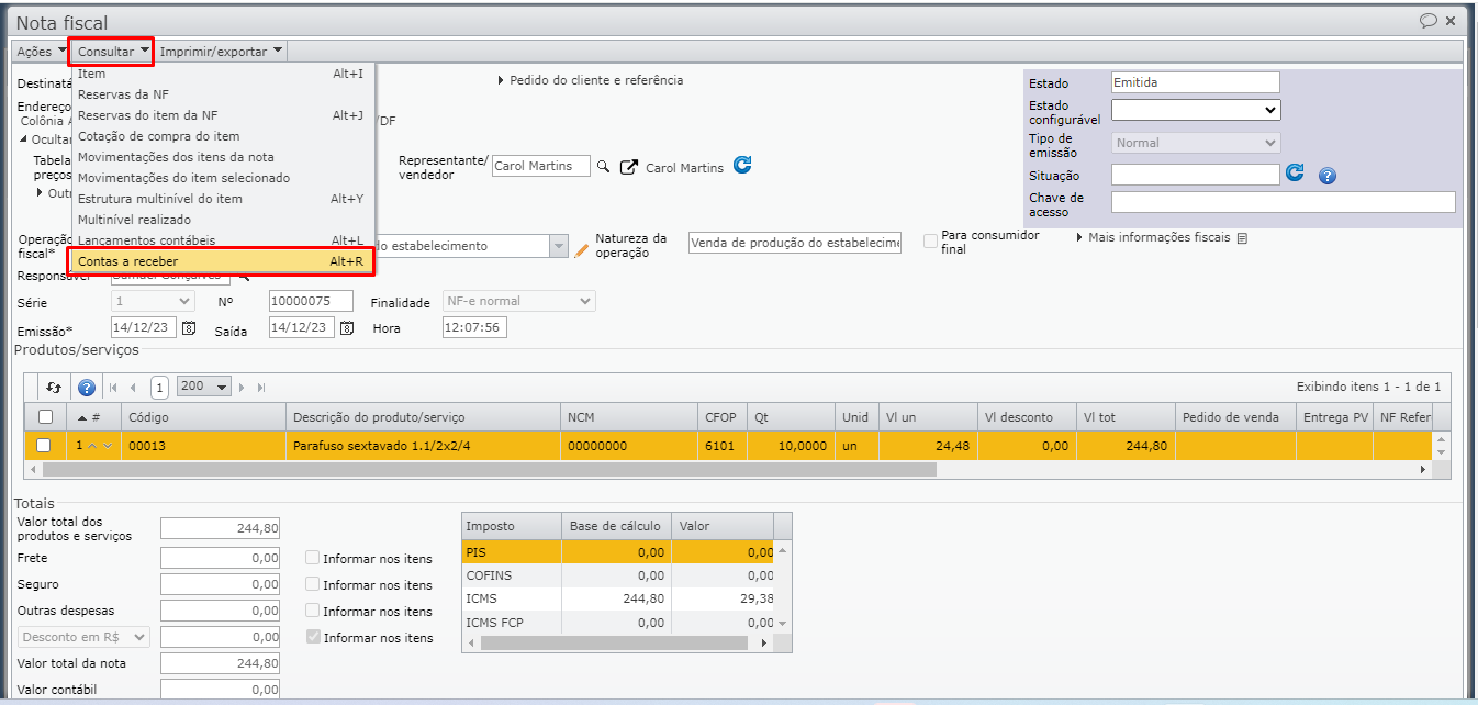 1) A partir da edição da nota fiscal, acesse o menu “Consultar > Contas a receber/pagar”.