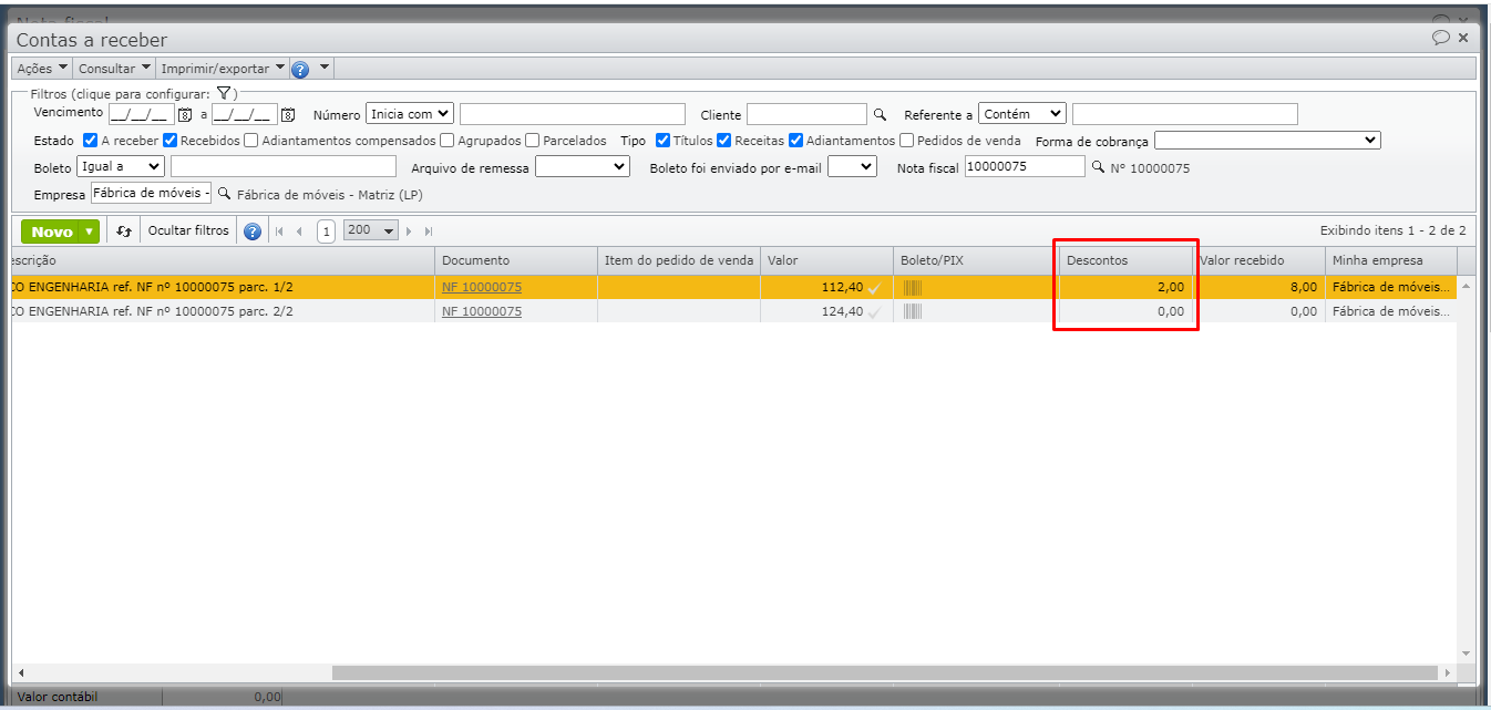2) Na janela de contas a receber/pagar, verifique os títulos da NF e veja quais tem desconto concedido. Se preferir, habilite a coluna “Desconto”, para identificar com mais facilidade os títulos com desconto.