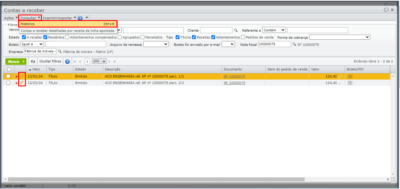 3) Para excluir o lançamento contábil de desconto e com isso poder desfazer a emissão/recebimento da nota, é necessário abrir a janela de edição do título clicando o ícone do lápis ou selecionando o título e acessando a opção “Consultar > Histórico”.