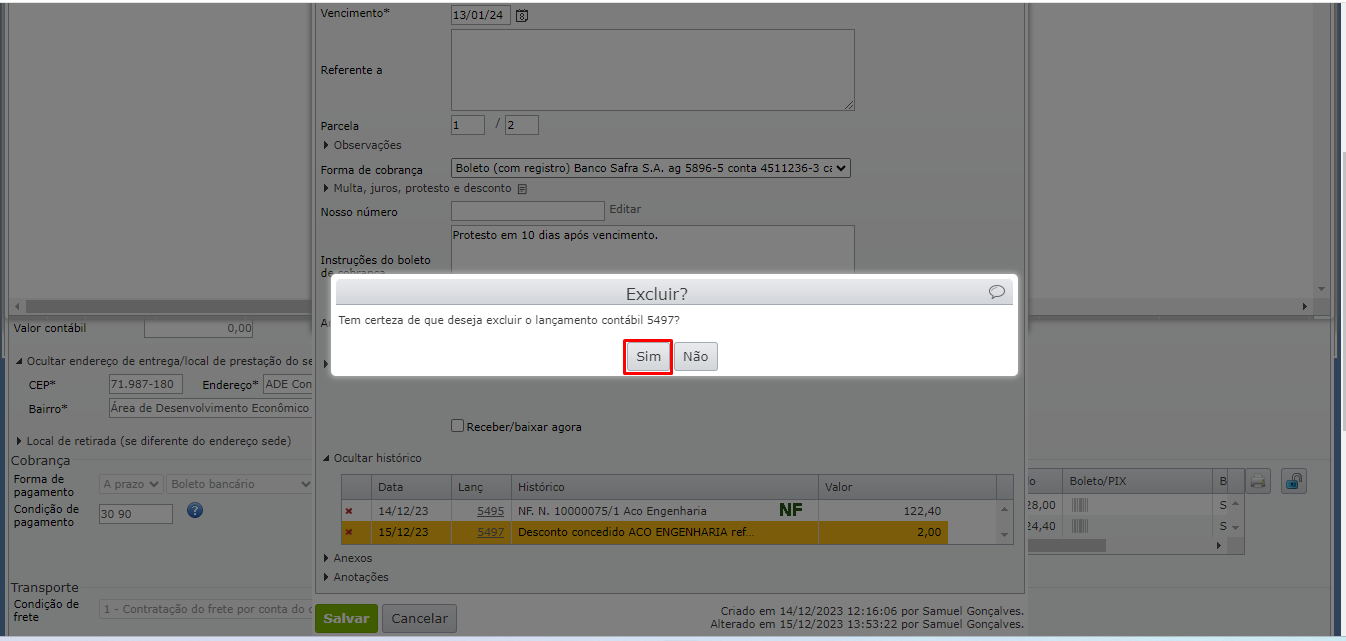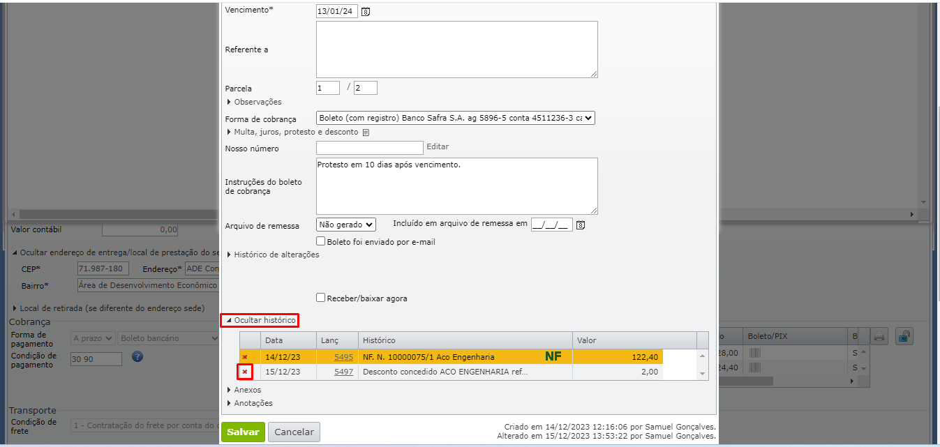 4) Na tela de edição, expanda a seção “Histórico” (não confundir com “Histórico de alterações”). Na seção ou tela de histórico, clique no botão “x” para excluir o lançamento contábil do desconto.