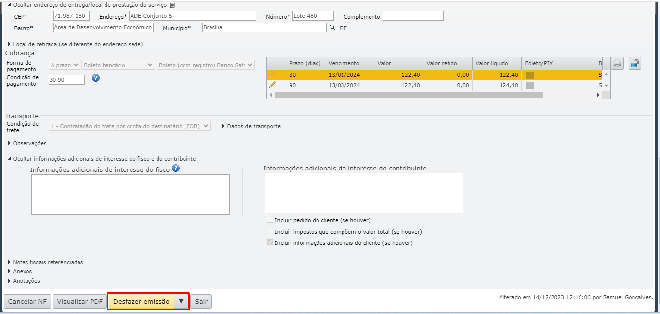 6) Após efetivar a exclusão do lançamento contábil do desconto, retorne à tela de edição da NF e desfaça a emissão/recebimento da nota.