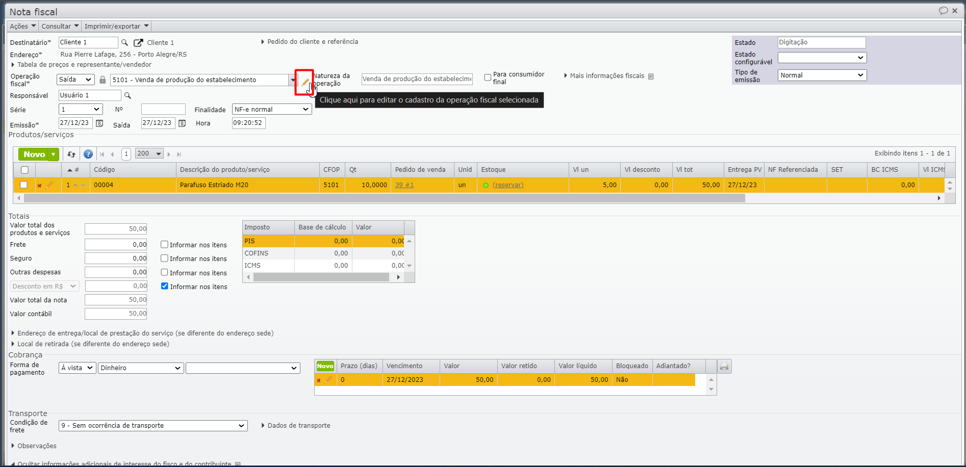 a) Na tela edição da NF, clique no ícone “lápis laranja”, ao lado do campo “Natureza da operação”, para abrir a tela de edição da operação fiscal.