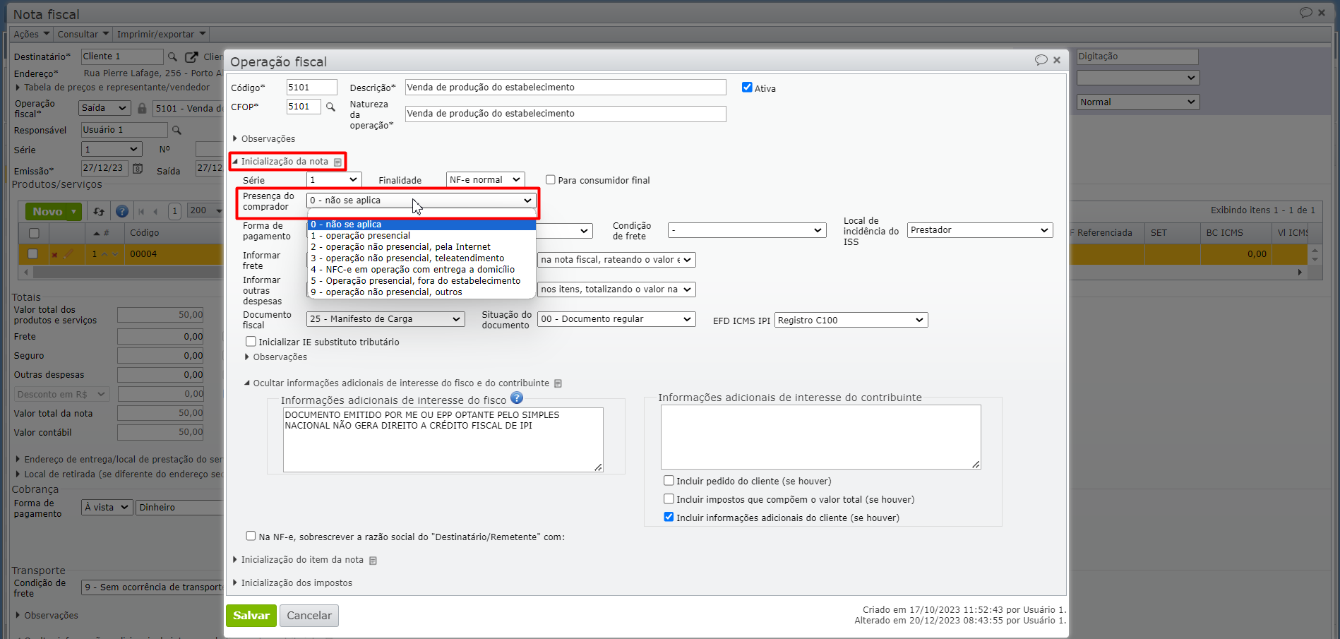 b) A seguir, clique na seção “Inicialização da nota” e preencha o campo “Presença do comprador”.