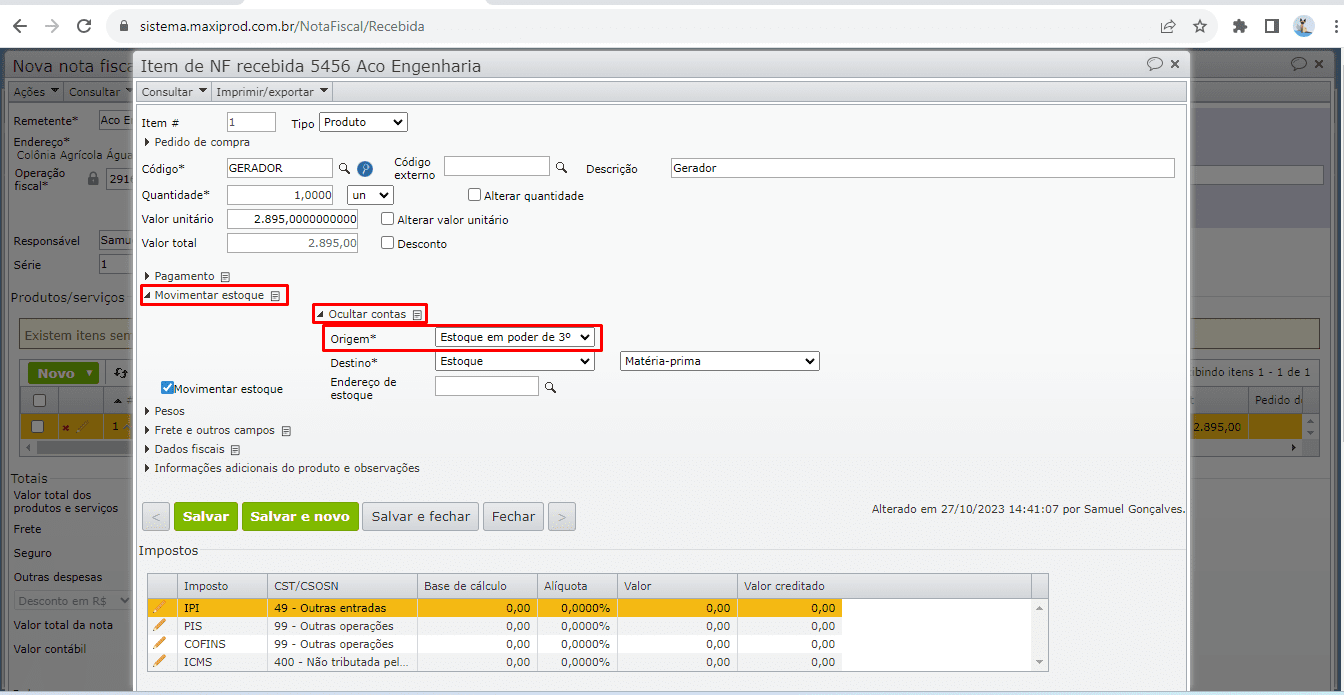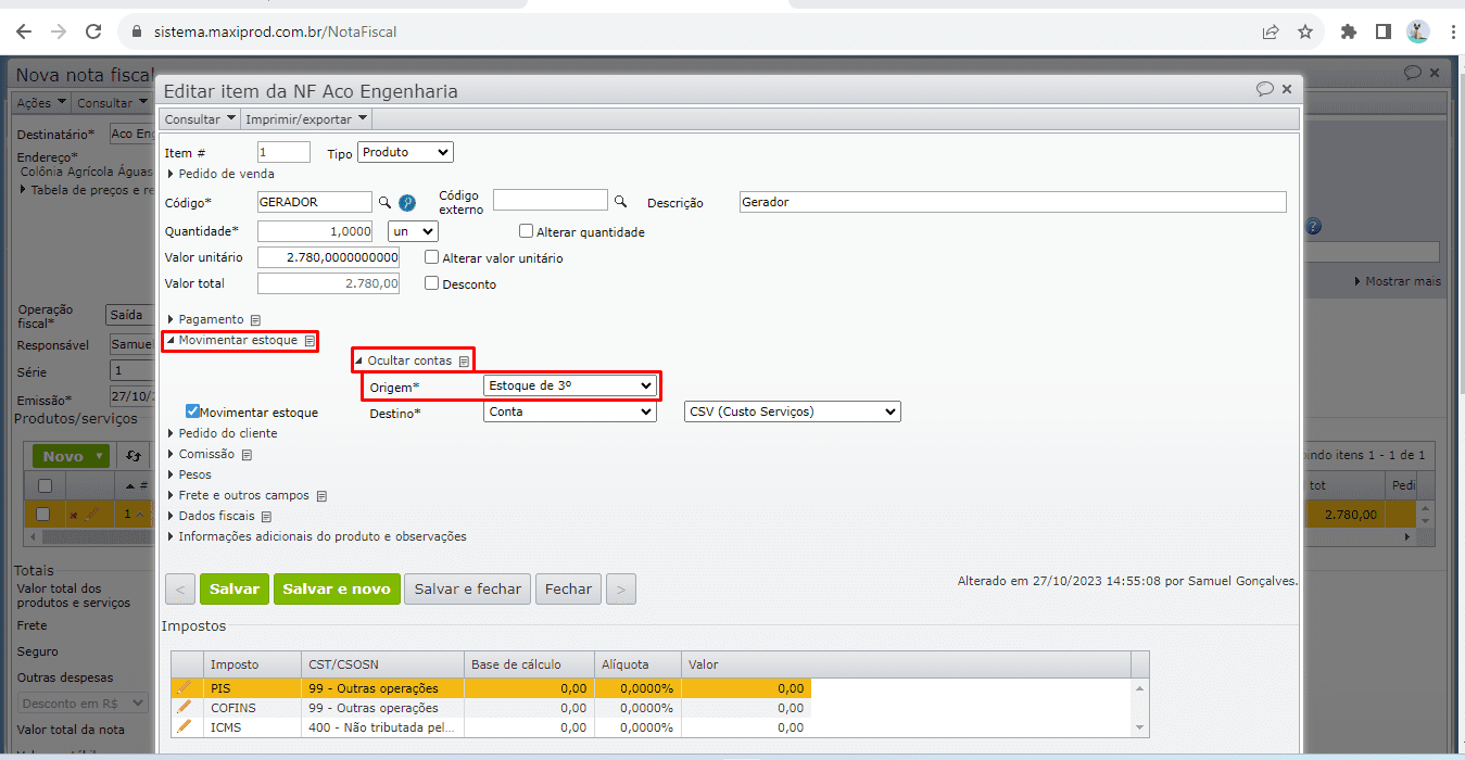 1) Acesse a edição do item da nota, seção “Movimentar estoque” , expanda a aba “Contas” e verifique o conteúdo do campo “Origem”.