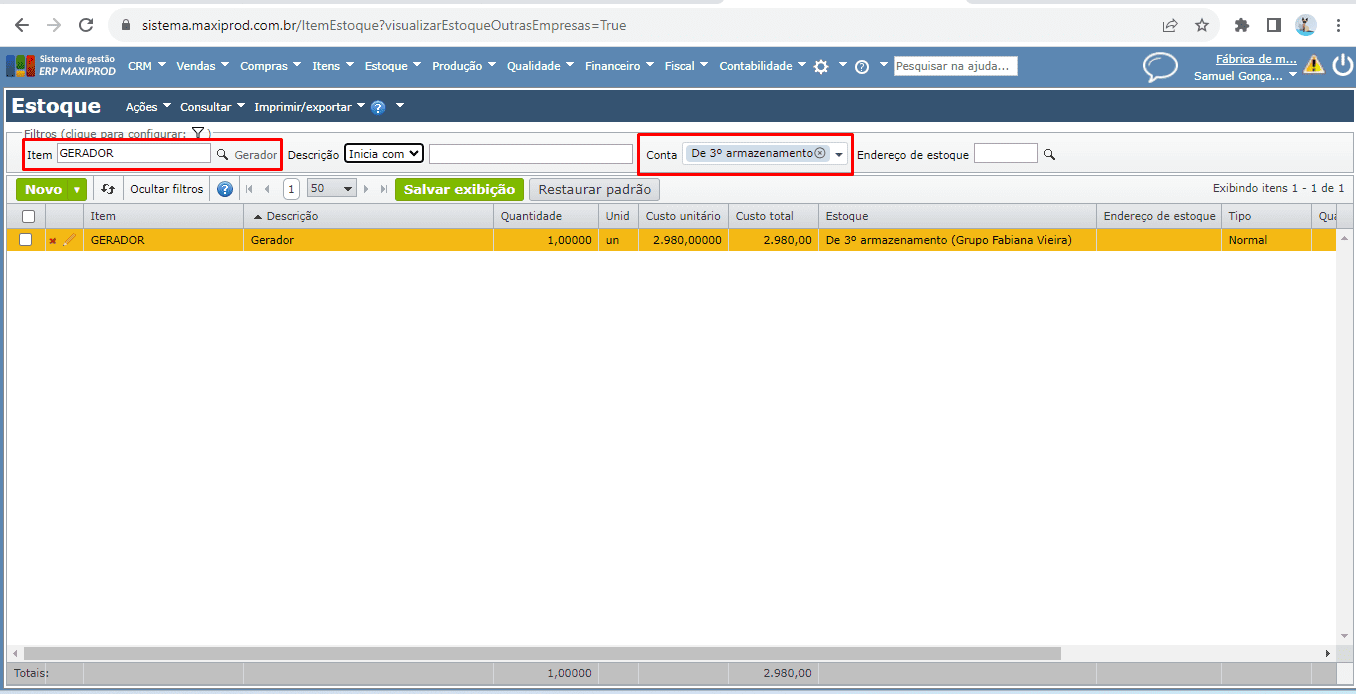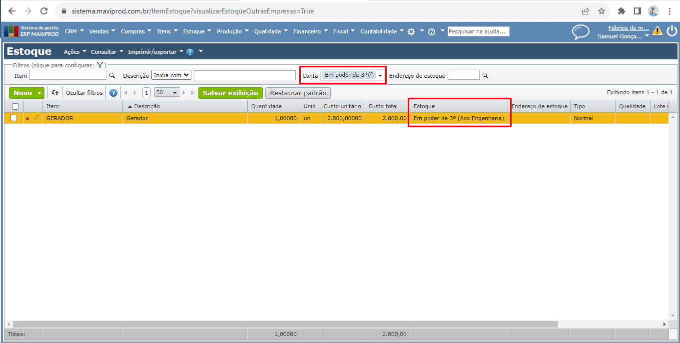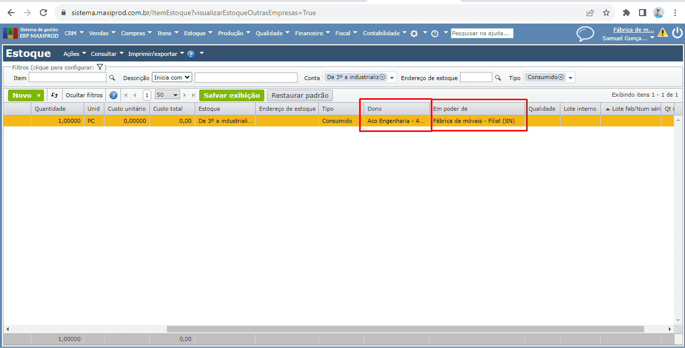 2) A seguir, acesse “Estoque > Estoque” e filtre pelo código interno do item na conta “Estoque de 3º (terceiros) a industrializar/armazenamento/a consertar”. Veja se há registro de estoque válido para esta operação, cujo dono seja o mesmo destinatário da NF de saída e que não esteja reservado para outra NF ou pedido.