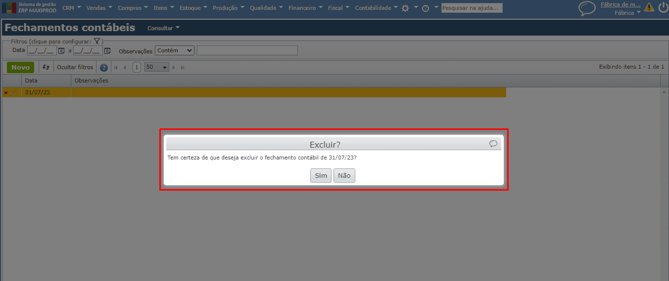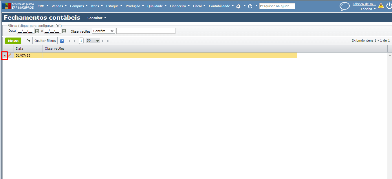 - Na grade de fechamentos contábeis, procure o fechamento a excluir e clique no ícone “x vermelho”;