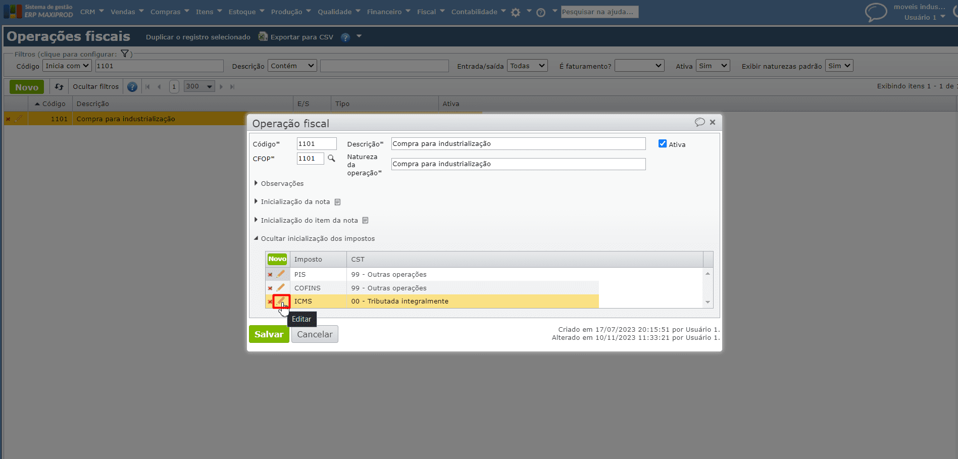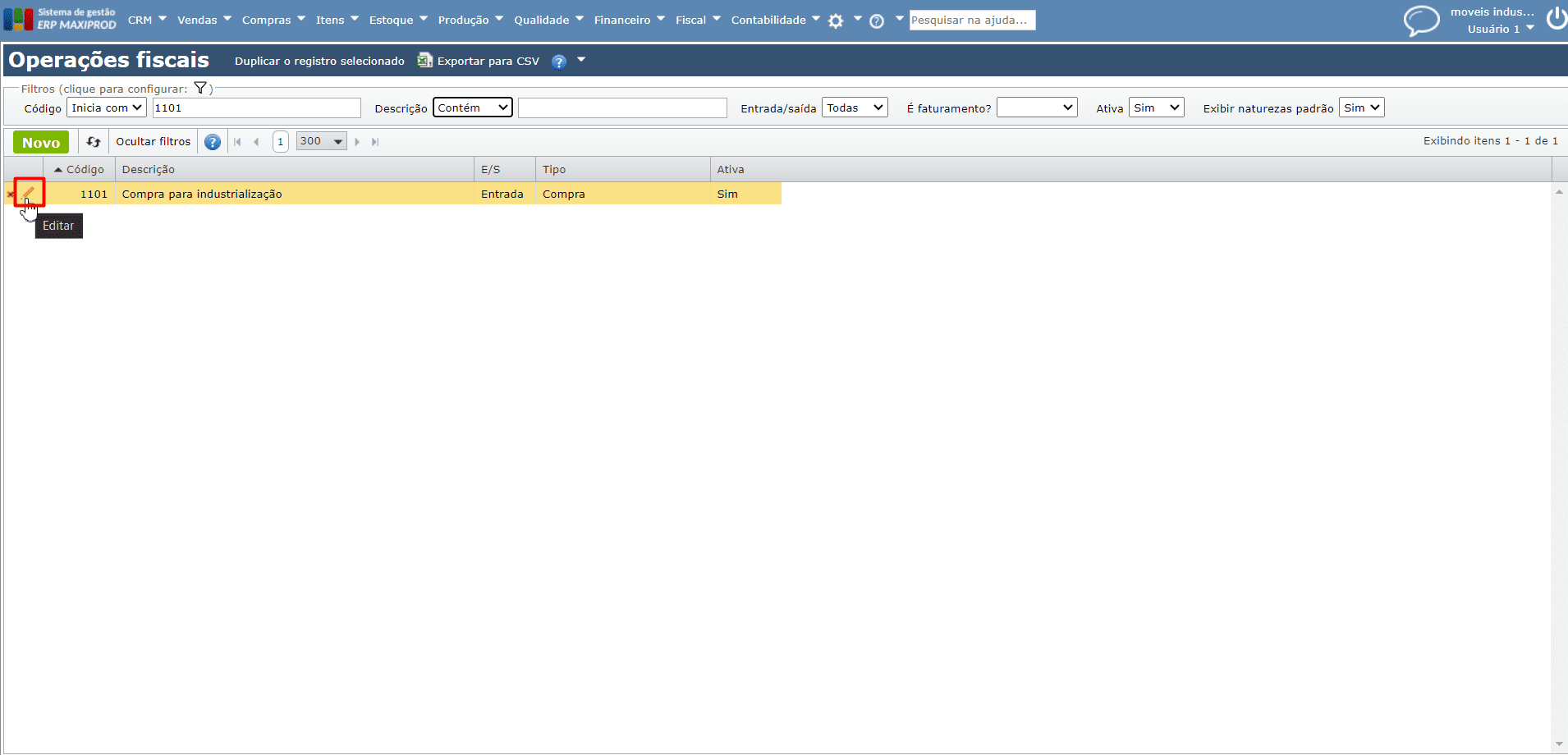 2) Identifique a operação fiscal utilizada na NF que apresentou o problema e clique sobre o ícone “lápis laranja” para abrir sua edição.