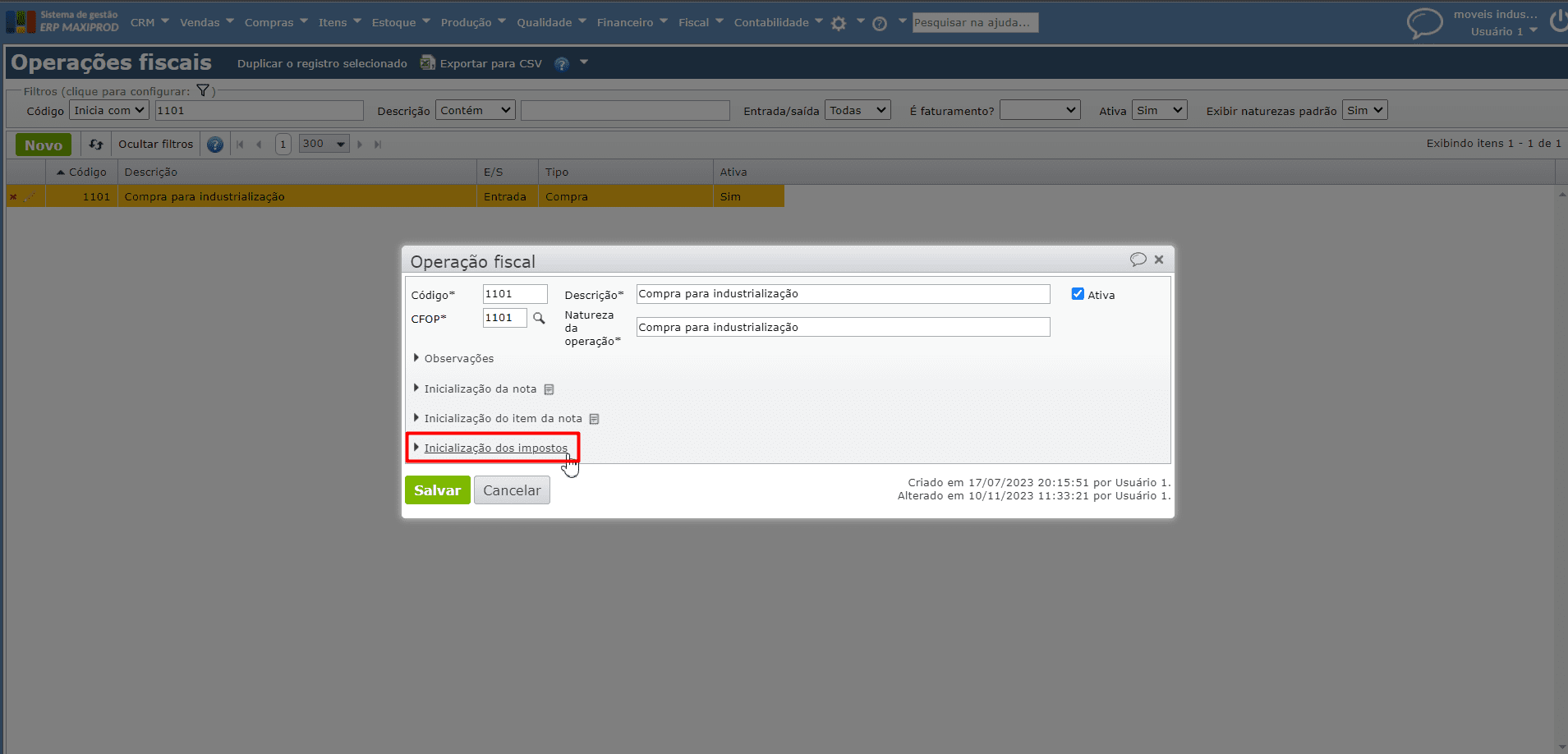 3) Clique sobre a seção “Inicialização dos impostos“.