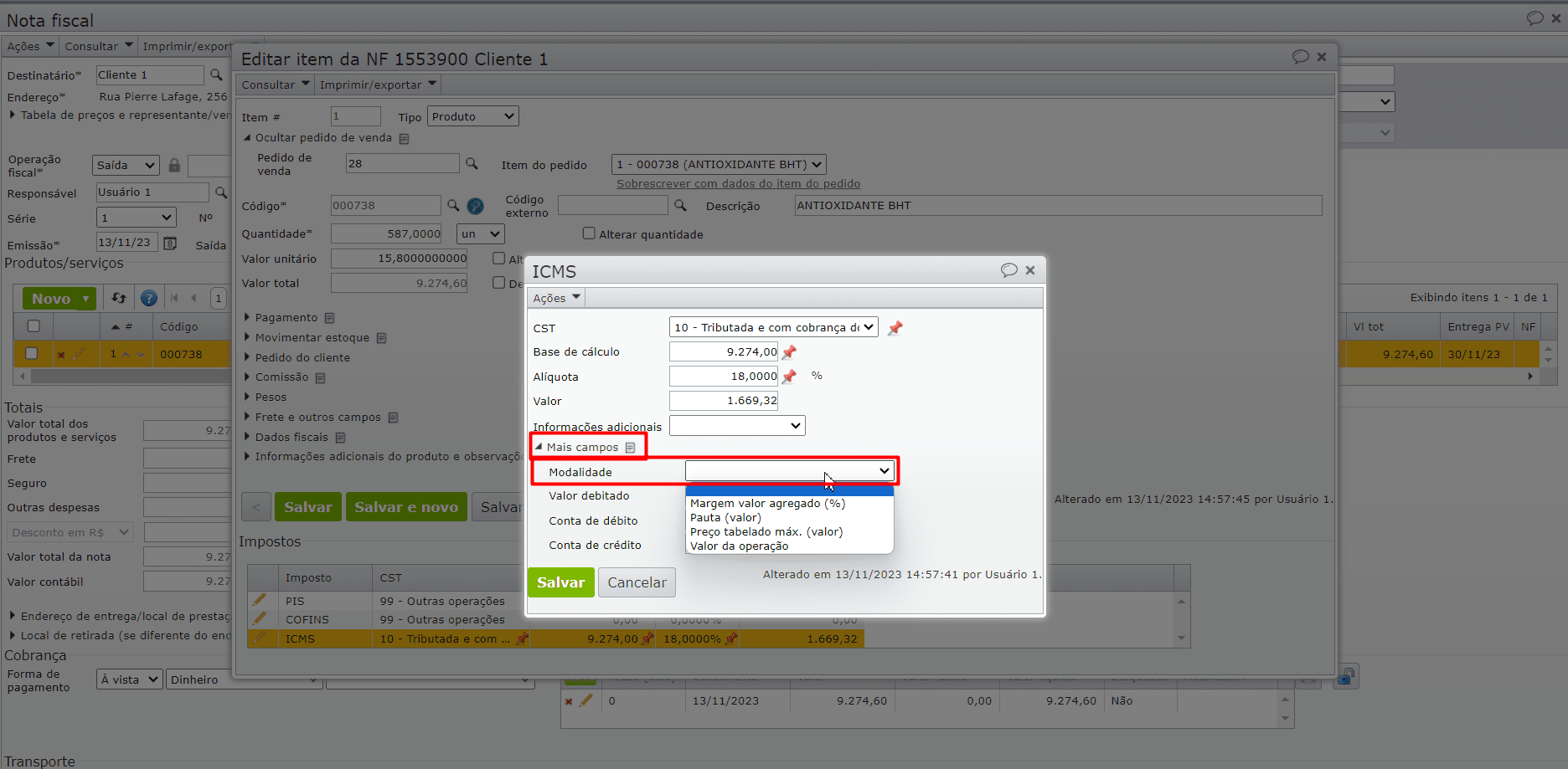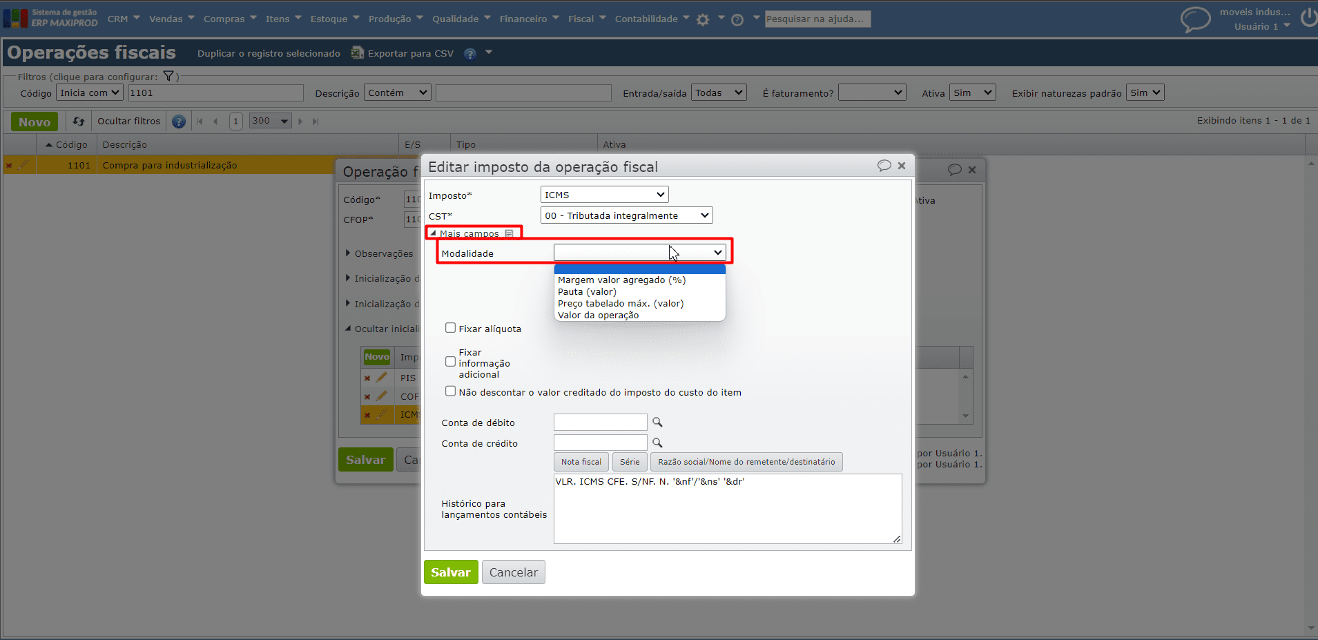 Essa mensagem é exibida no ERP MAXIPROD quando o imposto ICMS está inicializado no(s) item(ns) da Nota Fiscal (NF), mas não possuem a modalidade informada. Vejamos aqui como resolver este problema. Para esta demostração, utilizaremos as configurações padrão das operações fiscais do ERP MAXIPROD.