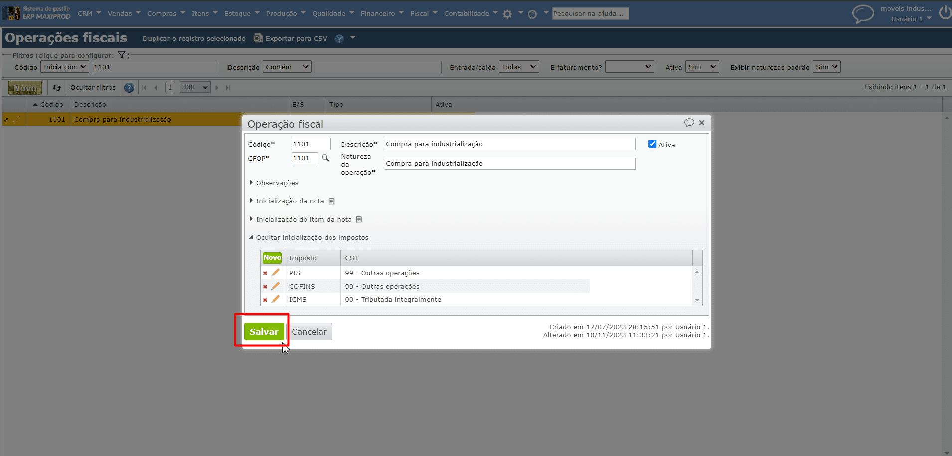 7) Logo após, salve a operação fiscal clicando sobre o botão verde “Salvar“.
