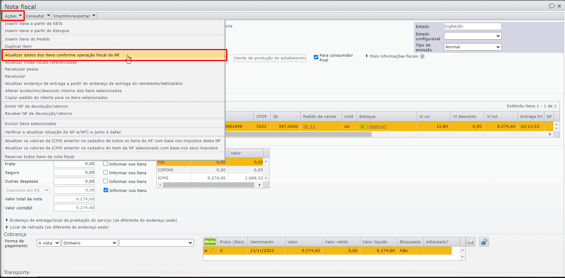 8) Logo após, basta entrar novamente na edição da NF e acessar o menu “Ações” > “Atualizar dados dos itens conforme operação fiscal da NF”.