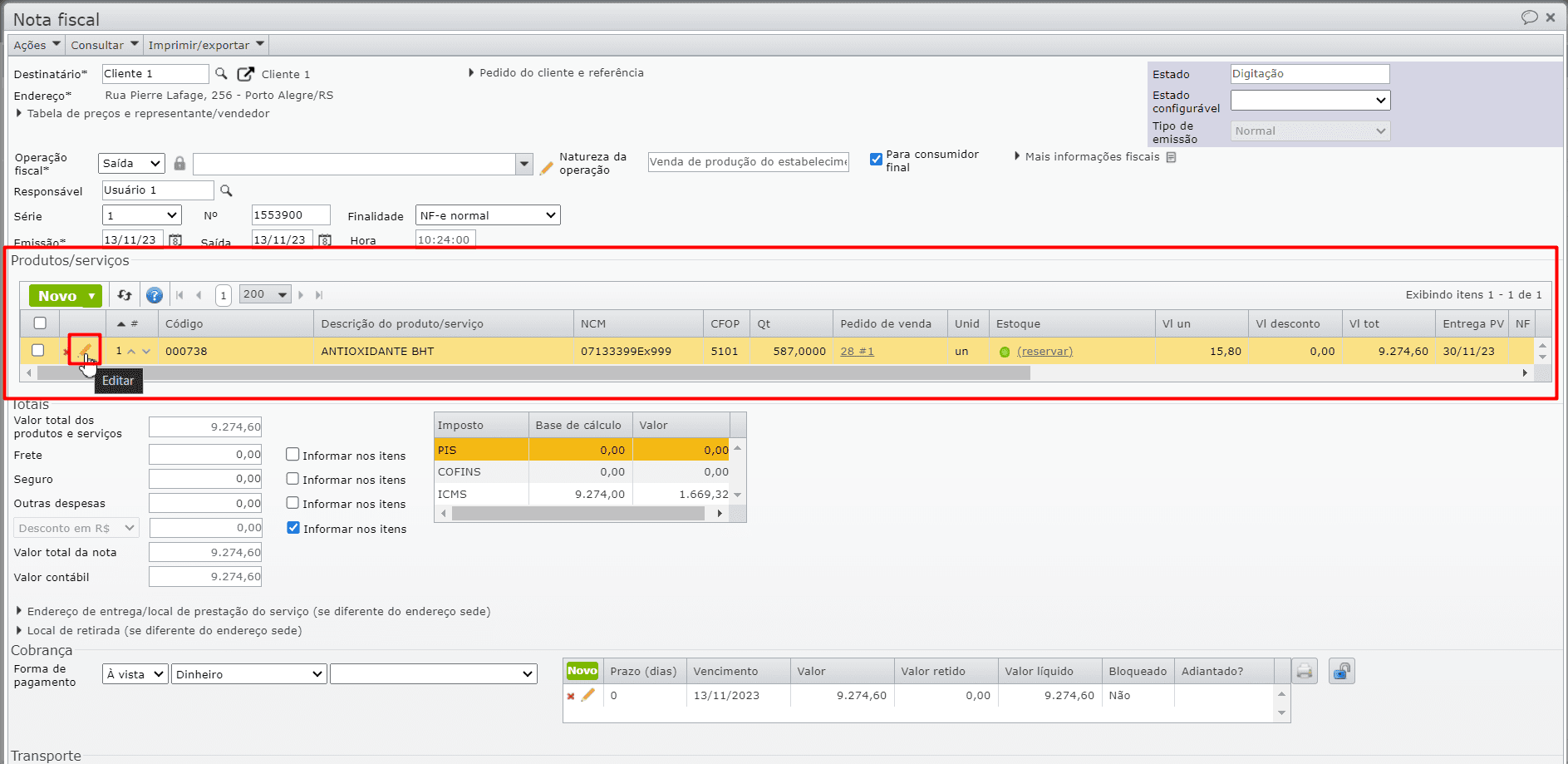 a) Acesse a edição da NF que apresenta o problema, identifique o item e clique sobre o ícone “lápis laranja” da seção “Produtos/Serviços“.