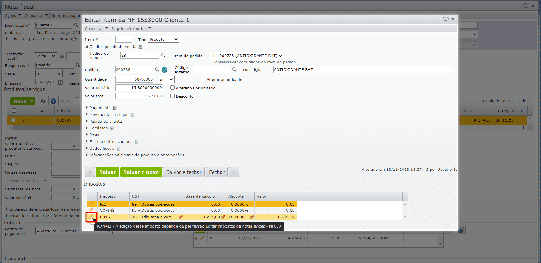 4) Em seguida, clique sobre o ícone “lápis laranja” para editar o imposto ICMS ou ICMS ST.