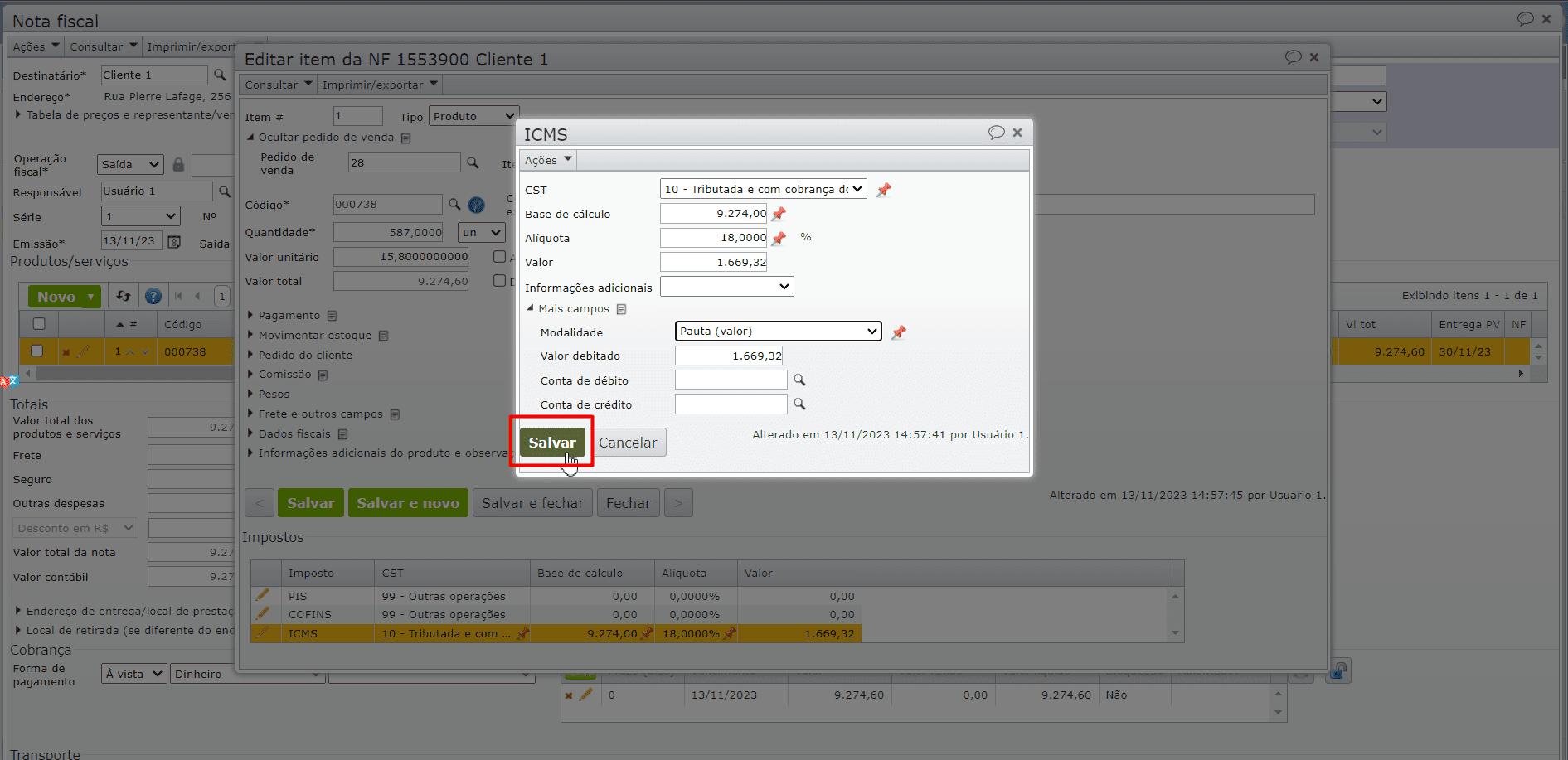 6) Em seguida, salve as alterações do imposto clicando sobre o botão verde “Salvar“.