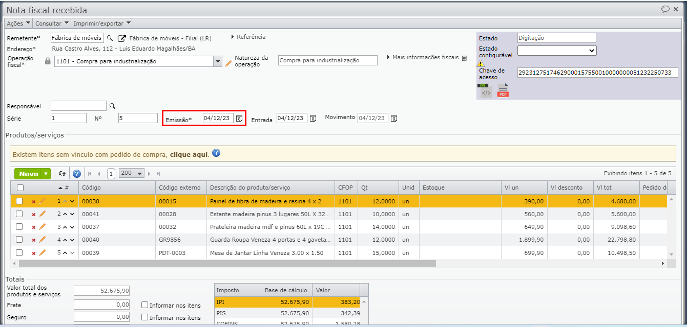 Se o usuário tentar emitir ou receber a NF, informando uma chave de acesso com ano/mês da data de emissão diferente do ano/mês da data de emissão informada na edição da nota, o sistema retorna a mensagem “O ano/mês de emissão da nota fiscal diferem do ano/mês contidos na chave de acesso.” e bloqueia o processo. Para corrigir, acerte a data de emissão da NF no sistema: