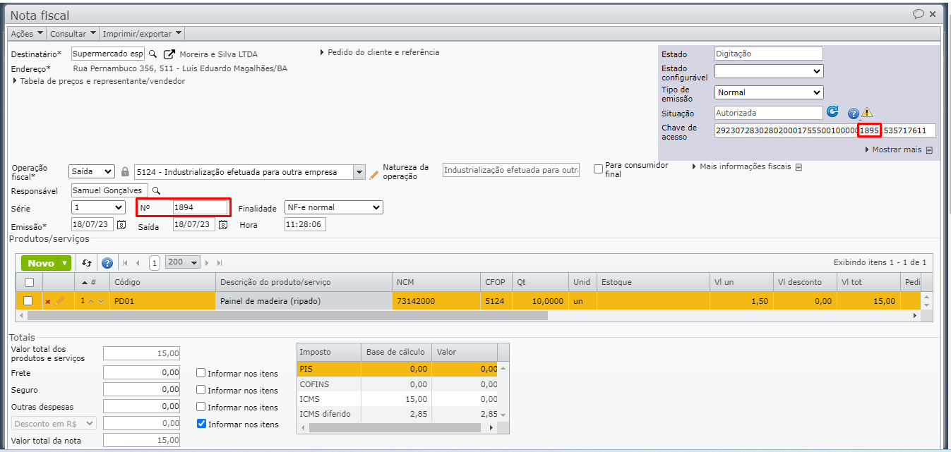 Se o usuário tentar emitir ou receber a NF, informando uma chave de acesso com o trecho “número” diferente do “número” informado na edição da nota, o sistema retorna a mensagem “O número da nota fiscal difere do número contido na chave de acesso” e bloqueia o processo. Para corrigir, acerte o número da NF no sistema ou acerte a chave de acesso. Para saber como definir o próximo número das notas fiscais emitidas, clique aqui.