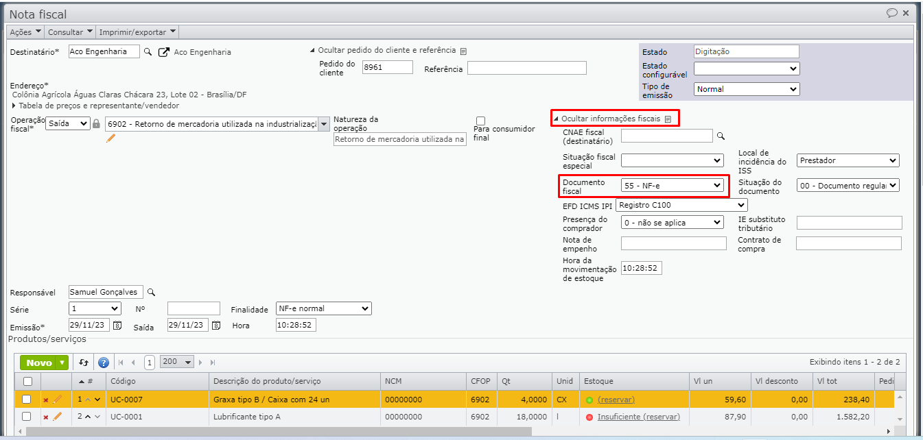 Na edição de uma NF, os tipos de documentos fiscais disponíveis para o campo “Documento fiscal” da seção “Mais informações fiscais” são: