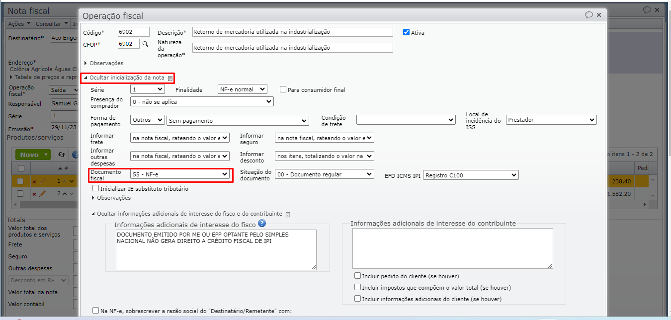 Na edição da operação fiscal, seção “Inicialização da nota” , define-se o tipo de documento a ser inicializado nos documentos recebidos que utilizam aquela operação fiscal.