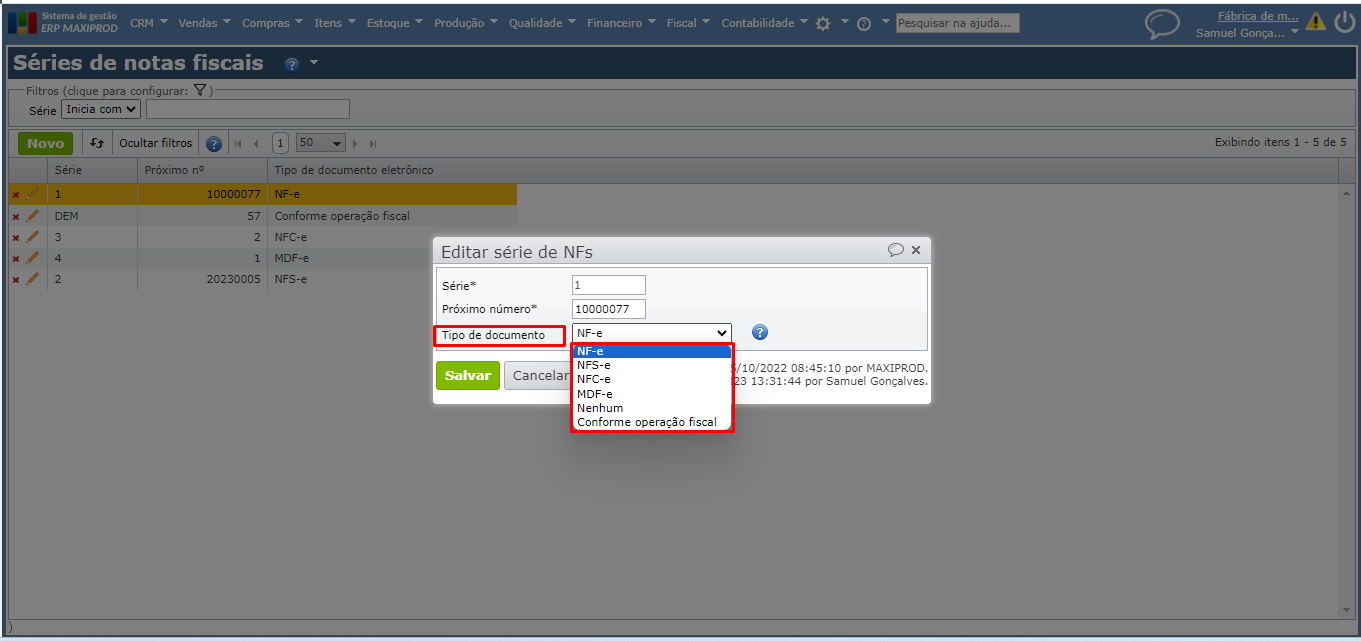 Na edição da série fiscal, campo Tipo de documento, define-se o tipo de documento a ser inicializado nos documentos emitidos que utilizam aquela série fiscal.