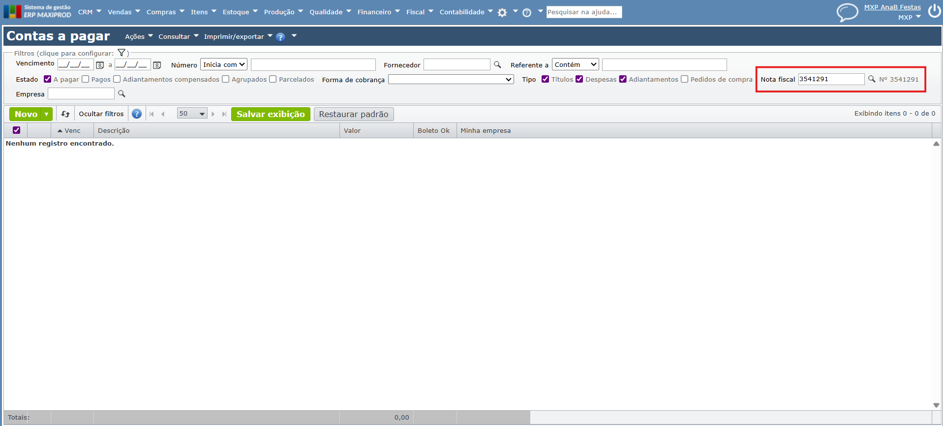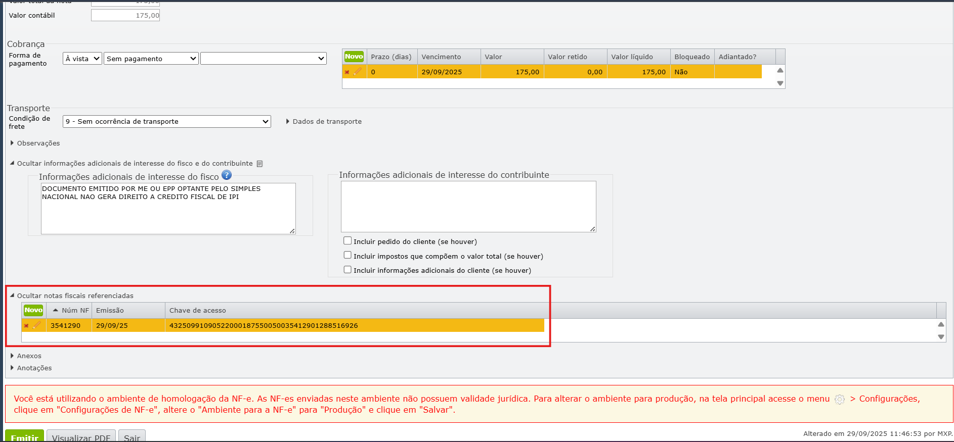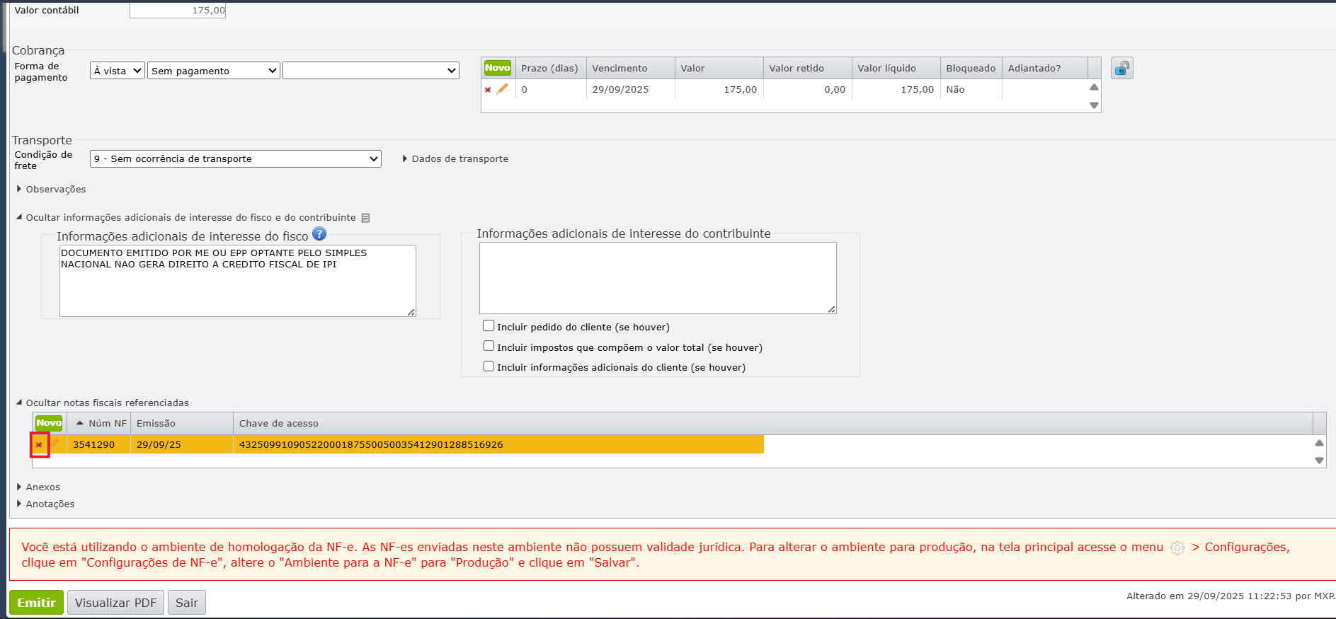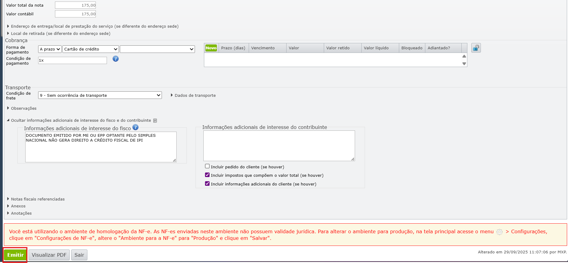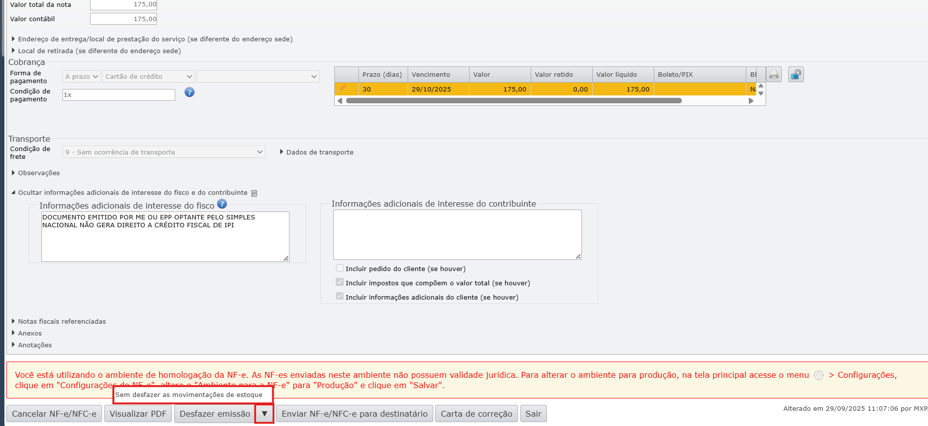 Observação: quando a nota fiscal está na situação “Autorizada”, isto significa que ela já foi enviada e aceita pela SEFAZ, não podendo ser reenviada. Como o que desejamos é realizar alterações no sistema referente ao pagamento, essas alterações ficarão restritas às informações armazenadas no sistema, pois não serão enviadas para a SEFAZ. Se deseja alterar informações desta NF-e na SEFAZ, é necessário emitir uma carta de correção ou cancelar esta NF-e e emitir uma nova.
