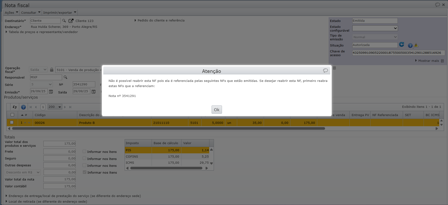 “Não é possível reabrir esta NF pois ela é referenciada pelas seguintes NFs que estão emitidas. Se desejar reabrir esta NF, primeiro reabra estas NFs que a referenciam: Nota n° ***”
