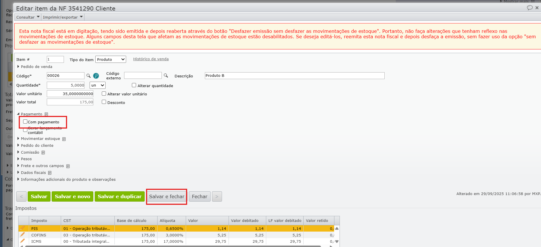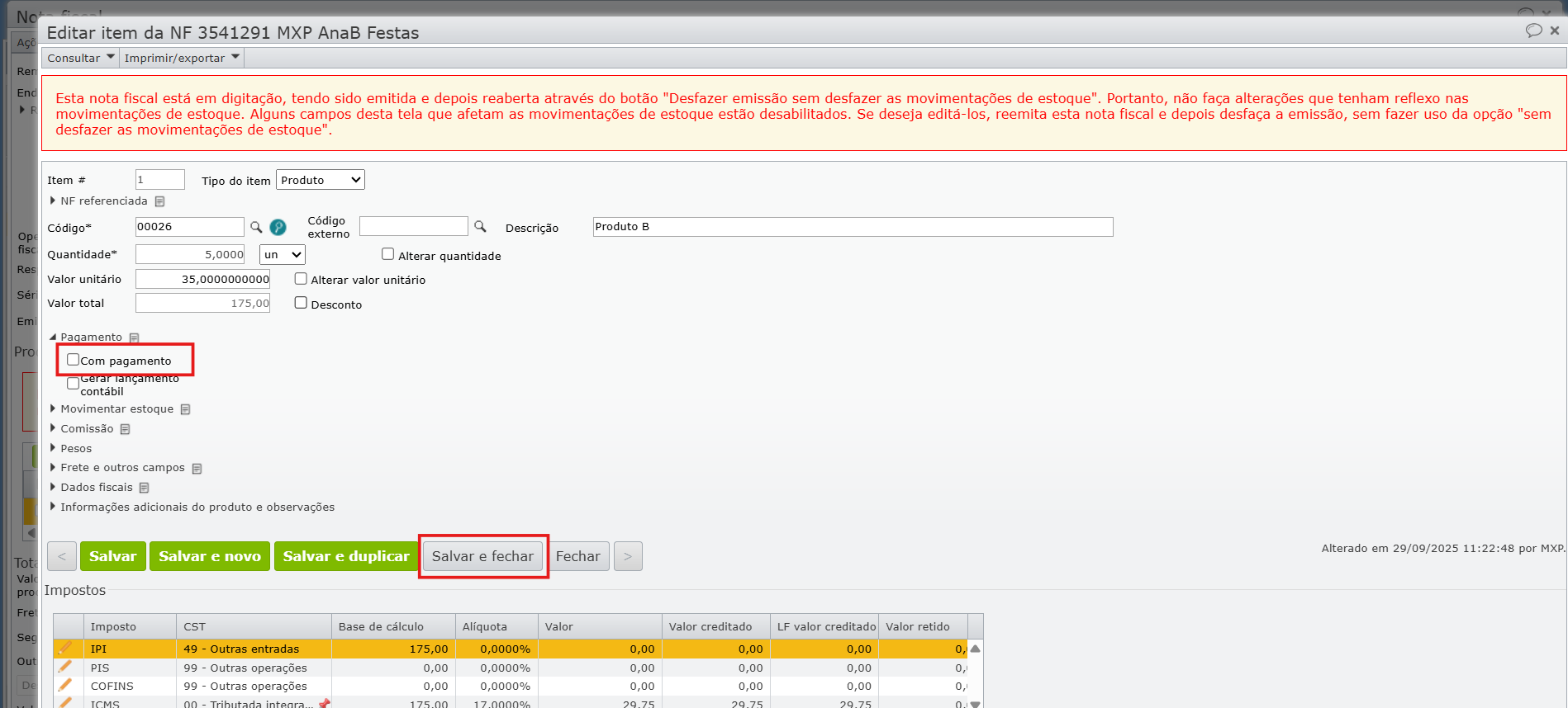 3) Na edição do item da nota, desmarque a opção “Com pagamento”.