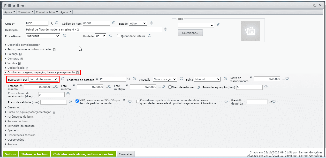 Para verificar a forma de estocagem do item, acesse o menu superior “Itens” , opção “Itens”, localize o cadastro do item e veja como está preenchido o campo “Estocagem por” na seção “Estocagem, inspeção, baixa e planejamento”. Para saber mais sobre formas de estocagem, clique aqui.