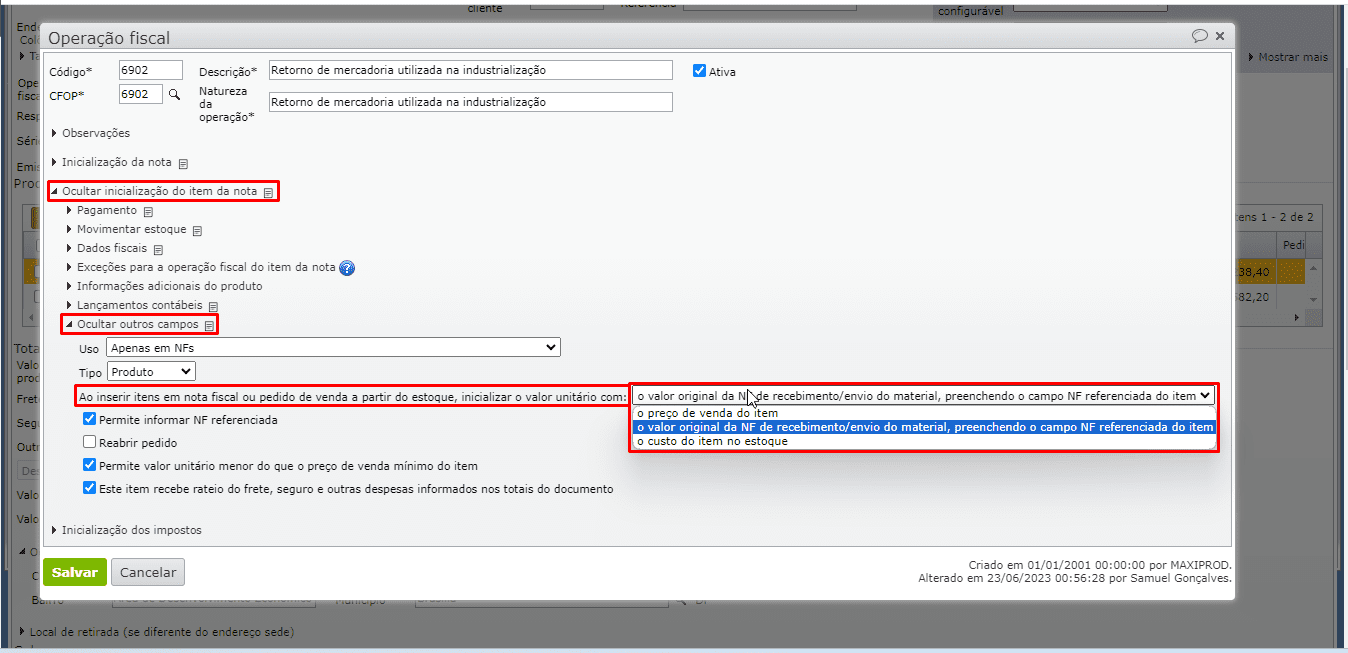 a) Na edição da operação fiscal, expanda a seção “Inicialização do item da nota > Outros campos” e veja a configuração “Ao inserir itens em nota fiscal ou pedido de venda a partir do estoque, inicializar o valor unitário com”. As opções são: