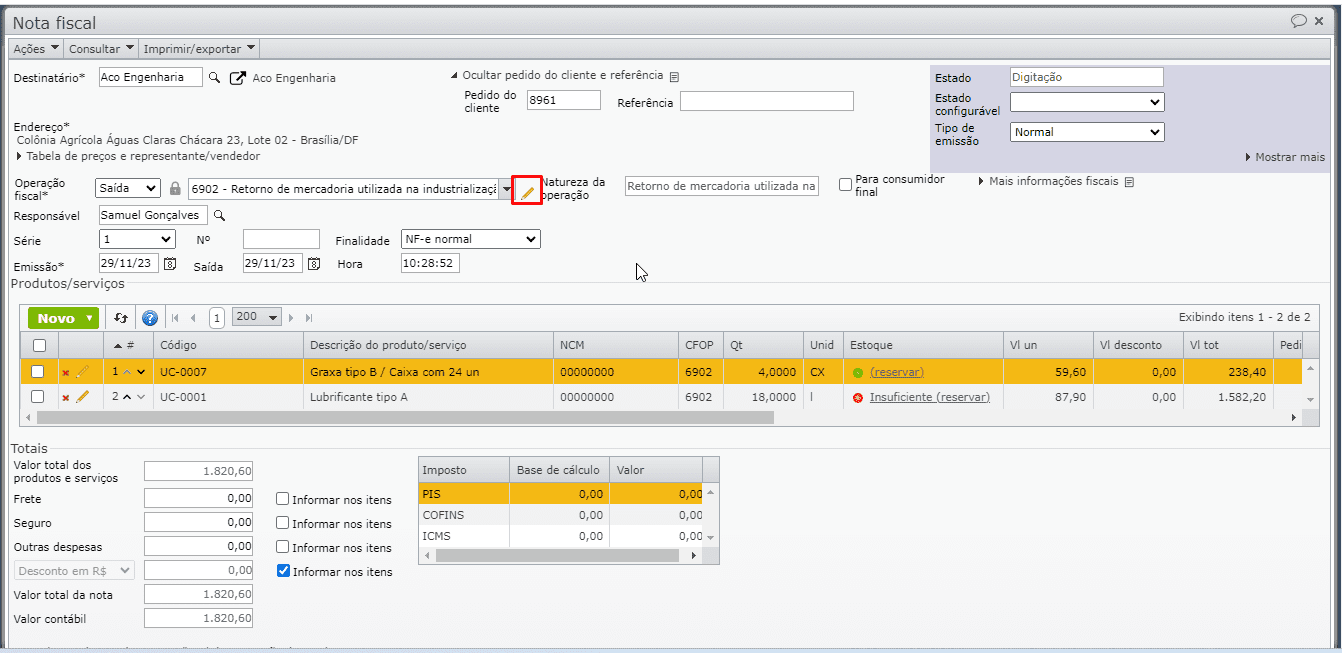 3) Para verificar como a operação fiscal principal está configurada para inicializar o valor unitário dos itens inseridos na NF a partir do estoque, clique no ícone do lápis ao lado direito do campo “Operação fiscal”.