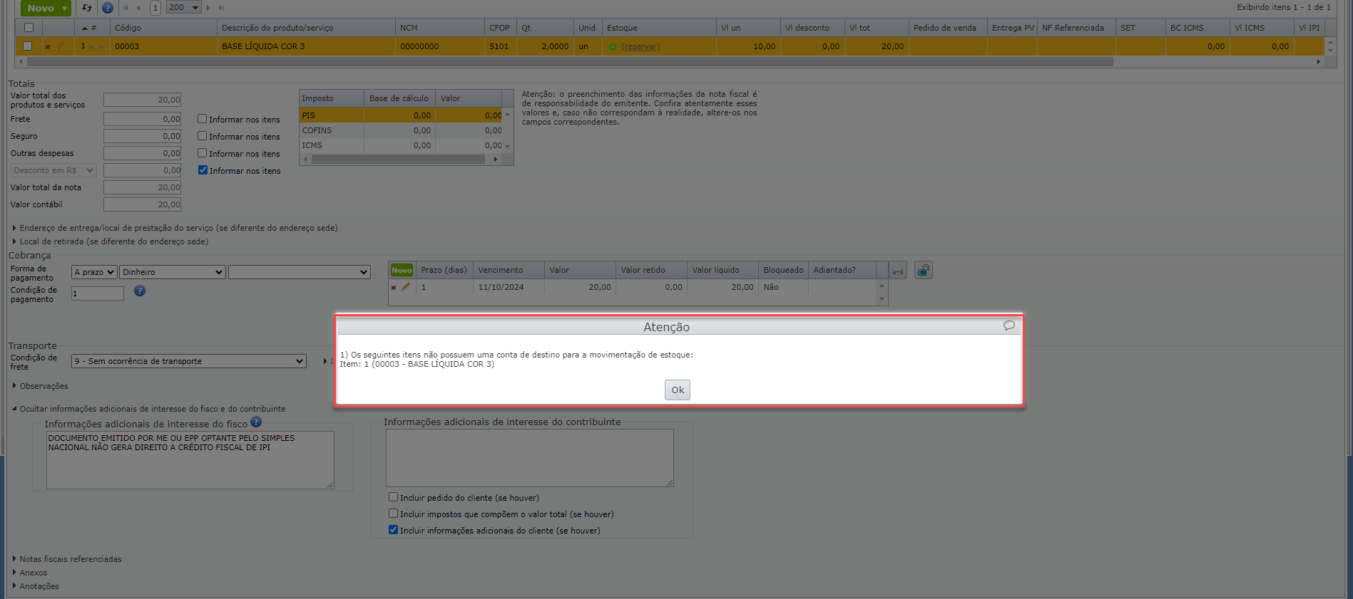 Neste exemplo, a mensagem está sendo exibida porque falta a conta de “Destino“.