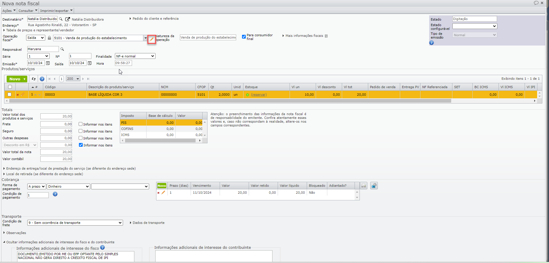 5) Para alterar somente o item da nota fiscal e prosseguir com a emissão ou recebimento, clique no “Lapis” para editar o item.