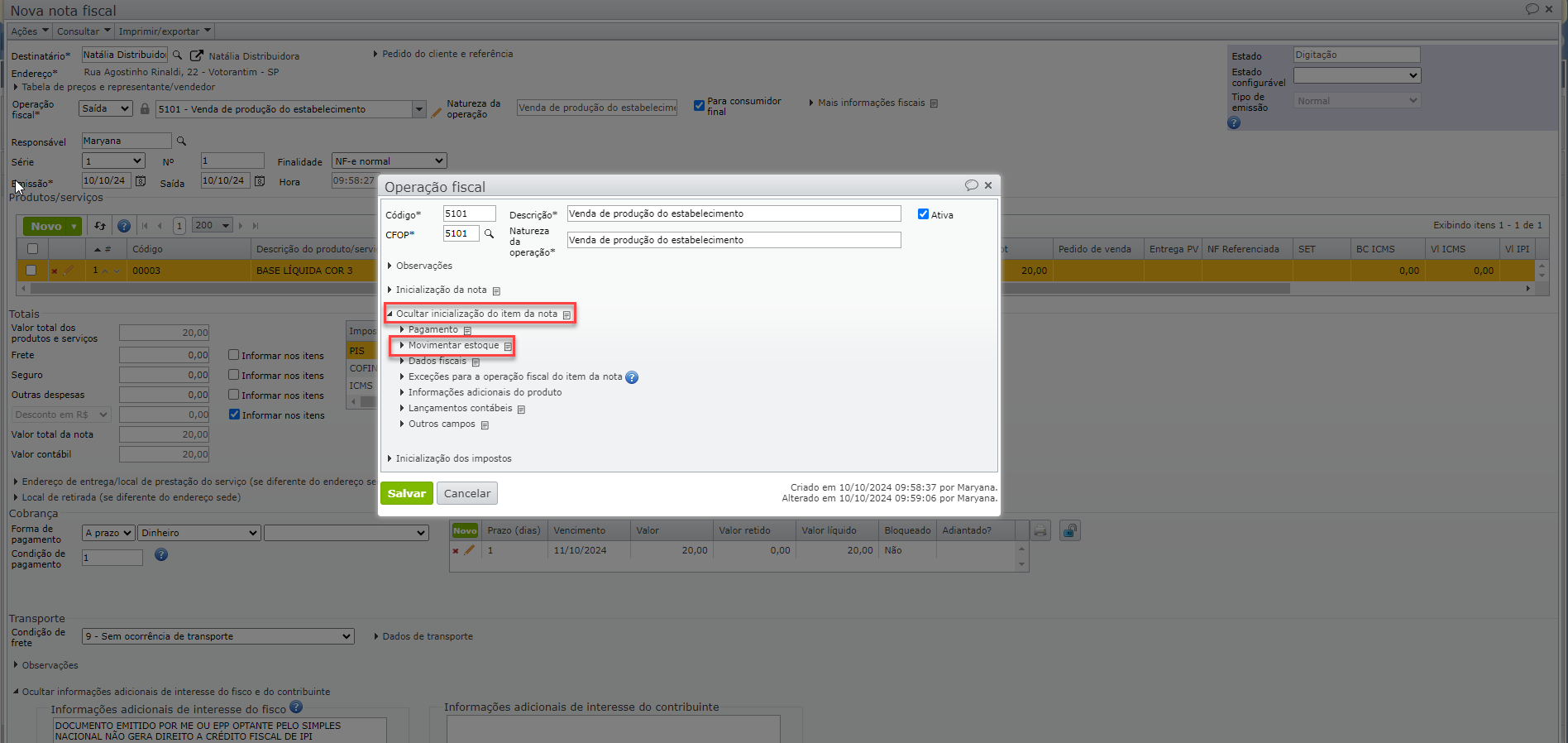 2) A conta de “Origem” e “Destino” é preenchida na operação fiscal para inicializar nos itens da NF, mas este campo pode não ter sido preenchido. Para alterar o campo na operação fiscal, clique na seção “Inicialização do item da nota” e depois em “Movimentar estoque“.
