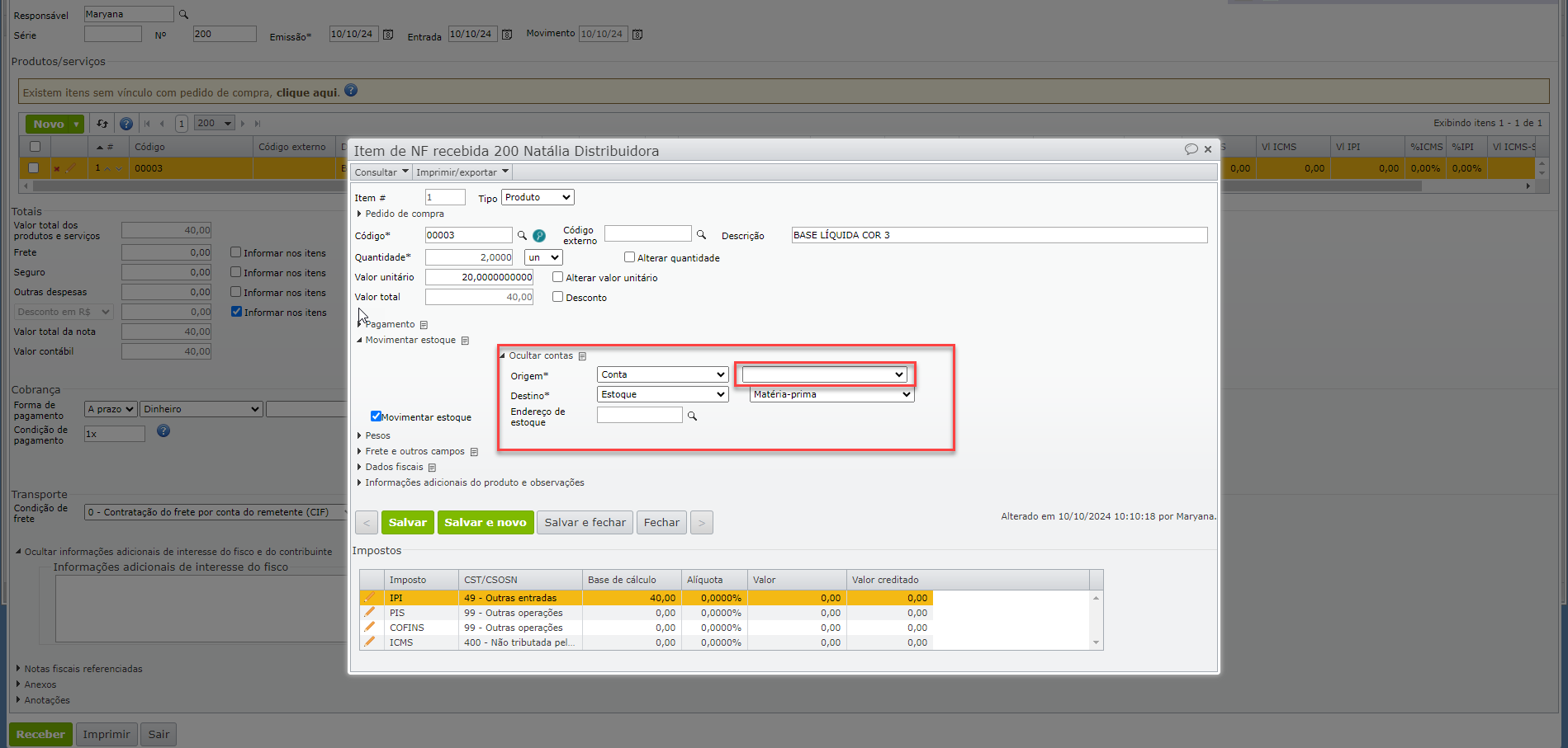 - Como incorporar o valor de um item a outro item de nota fiscal recebida?