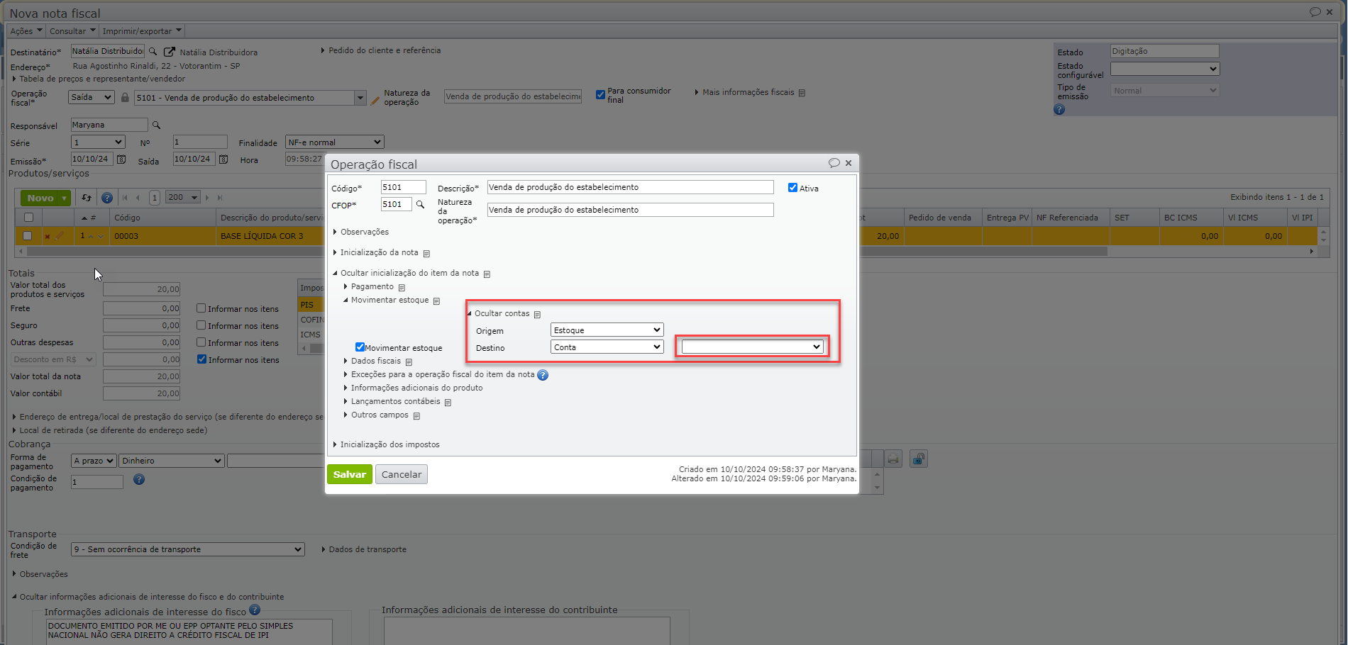 Observação: é importante que as contas contábeis de origem e destino sejam preenchidas na operação fiscal, para evitar erros que comprometem a emissão ou o recebimento da nota.