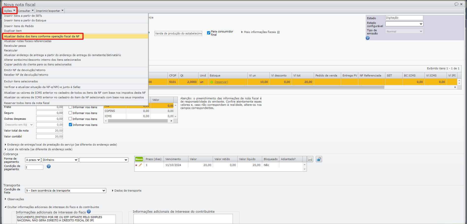 4) Após informar a conta, inicialize os itens da NF com as modificações feitas na operação fiscal. Clique no menu “Ações > Atualizar dados dos itens conforme operação fiscal da NF”.