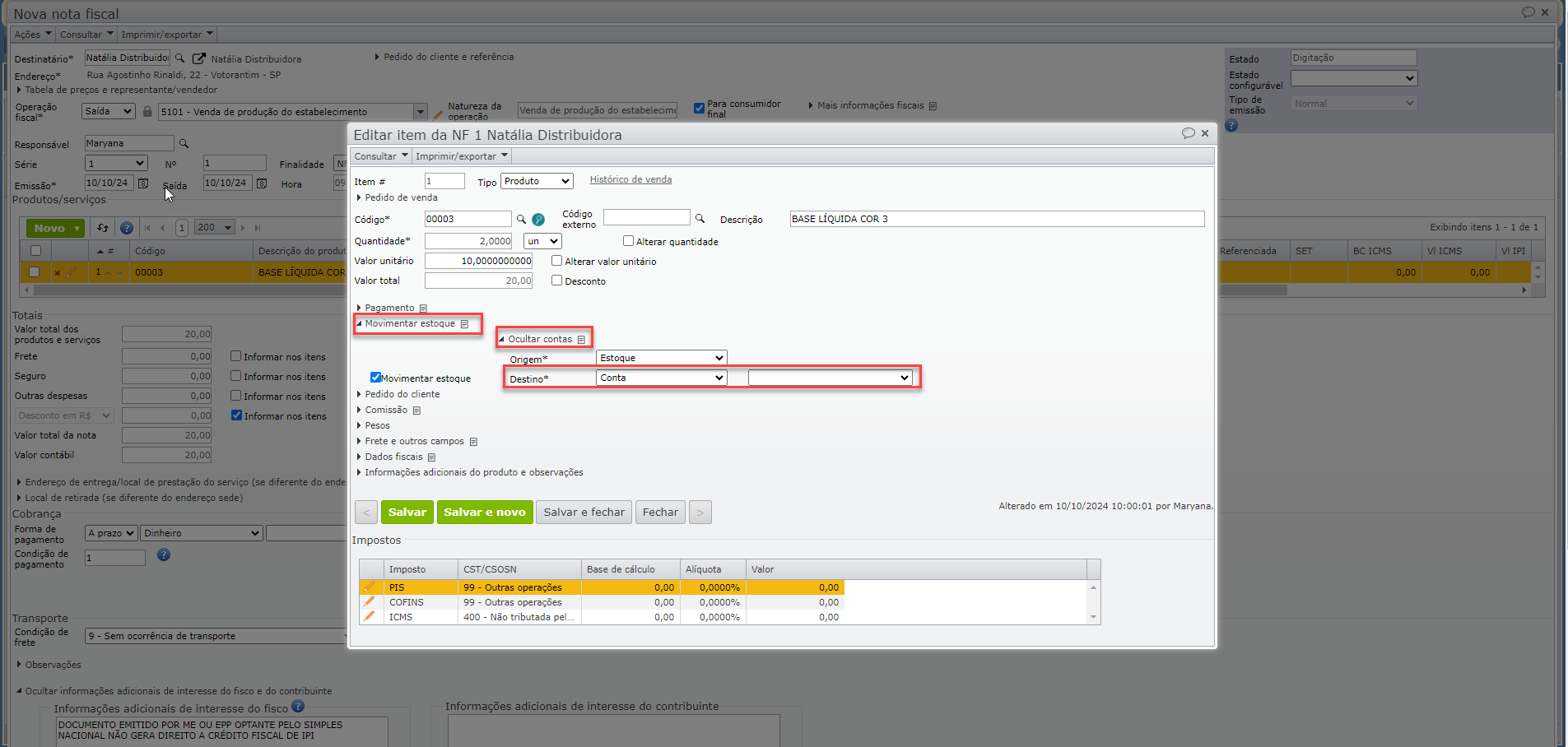 6) Na edição do item, clique em “Movimentar estoque > Contas” e insira a conta contábil de “Origem” ou “Destino”. Neste exemplo, selecione “Destino” e clique em “Salvar”.