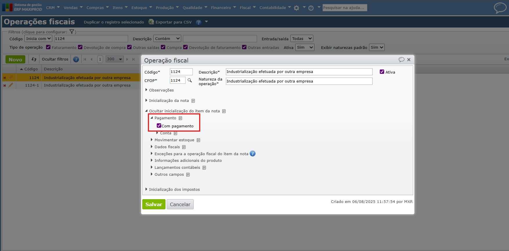 “Os seguintes itens possuem a opção ‘Com pagamento’ diferente da operação fiscal.”