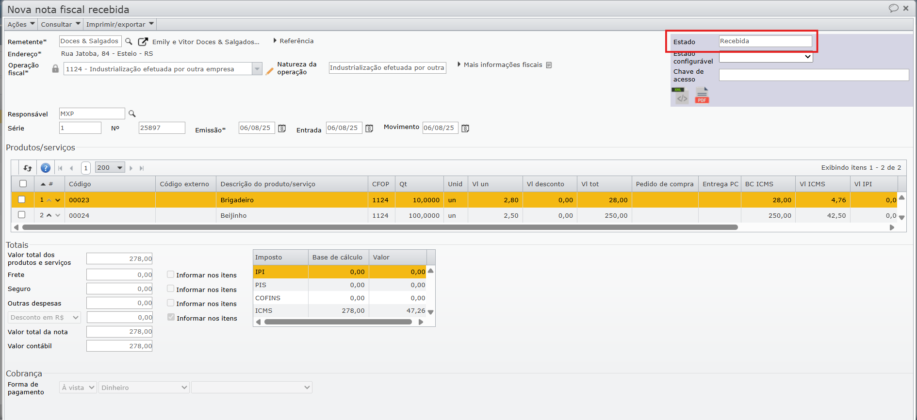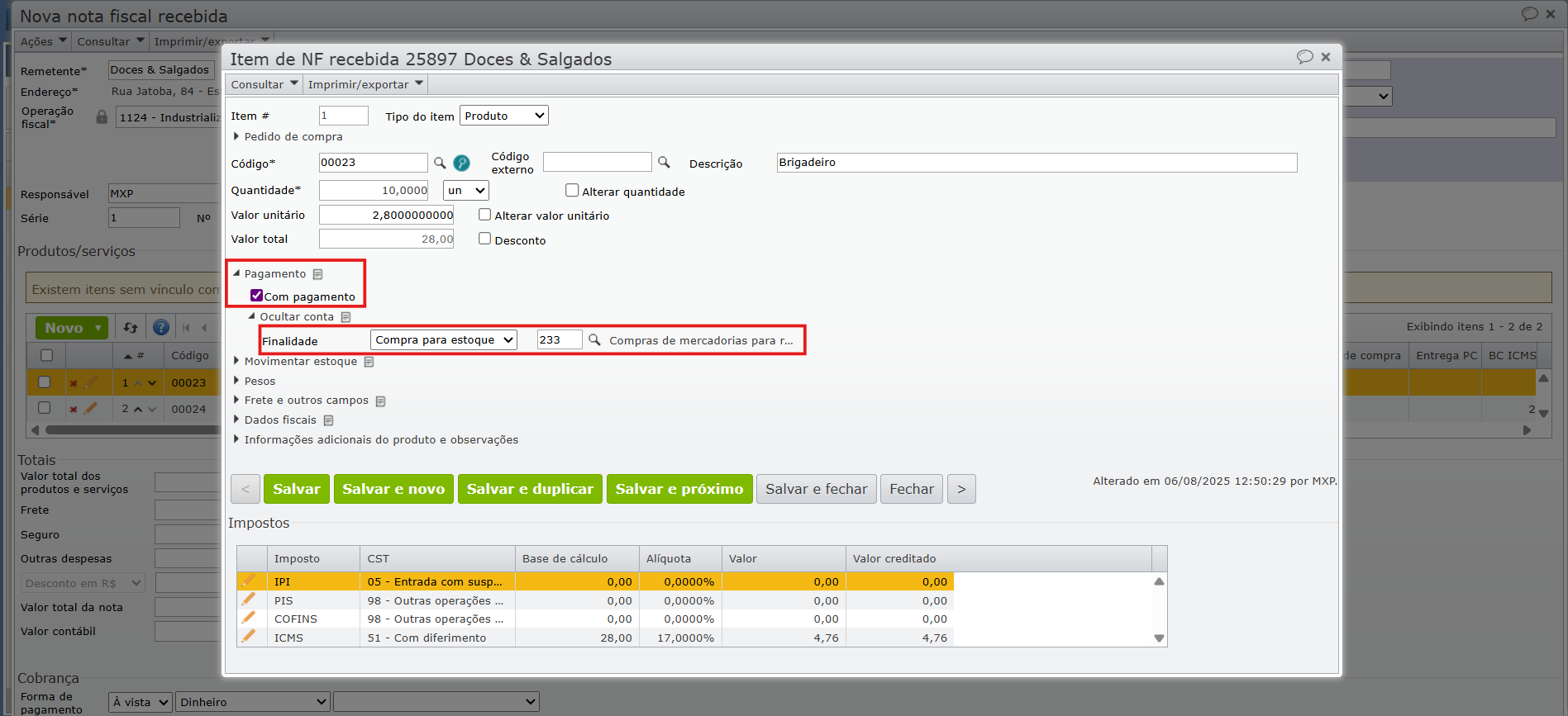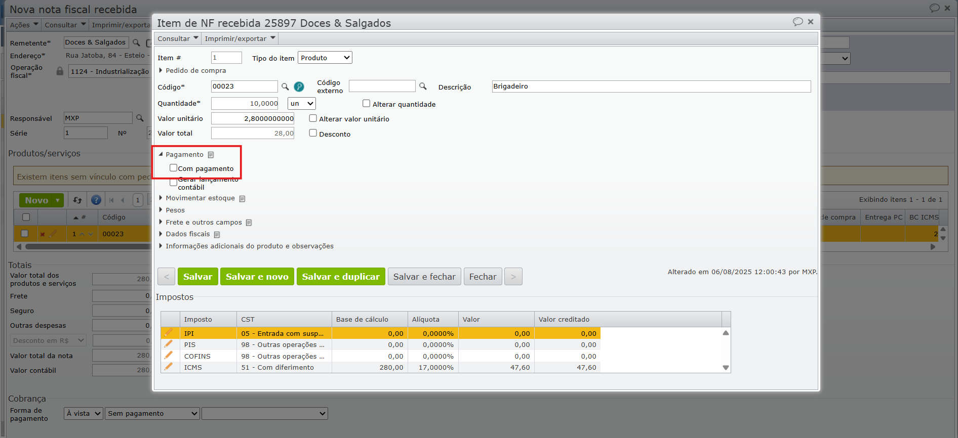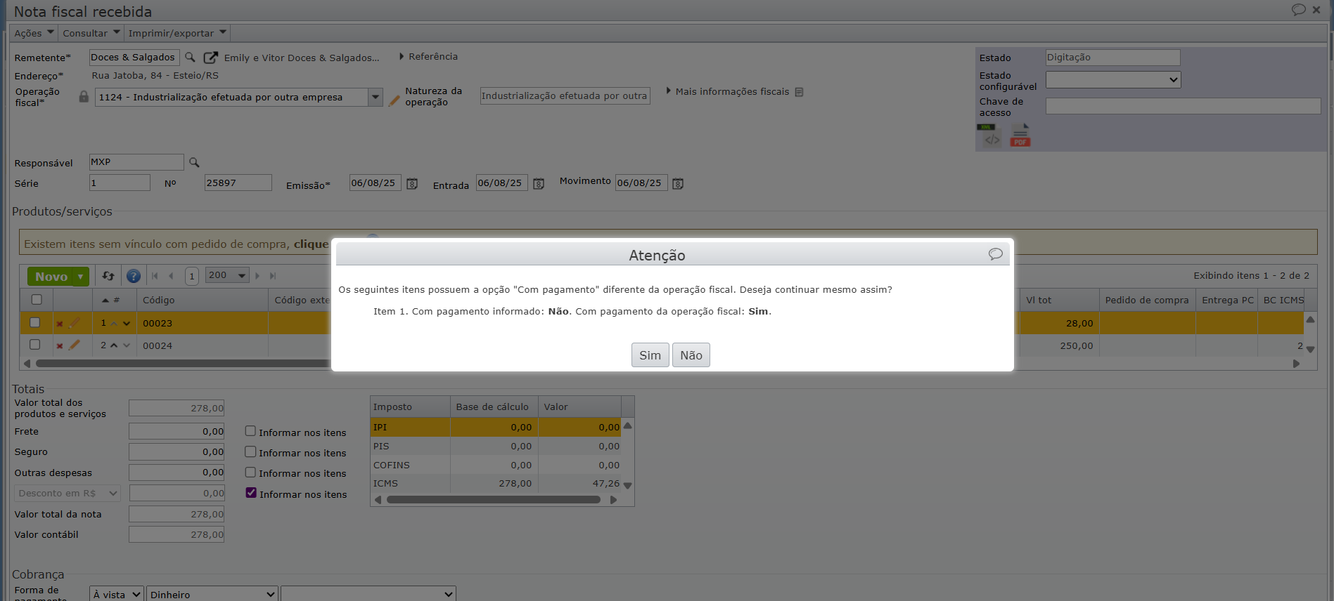 Por exemplo: se a operação fiscal padrão da nota exige pagamento (ex: industrialização efetuada por outra empresa), mas algum item foi cadastrado como “Sem pagamento” (ex: amostra grátis), o sistema alertará sobre essa inconsistência. Pois: