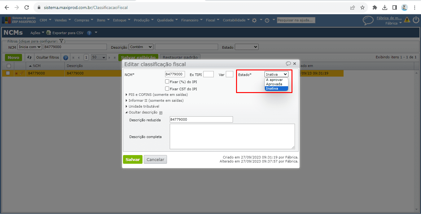 - Inativa: Este estado depende da alteração do usuário, existe para quando uma NCM perde a validade. Portanto, ao invés de excluir, deve se inativar, visto que este registro no sistema provavelmente terá vínculo com outros registros, como, por exemplo, itens de notas fiscais.