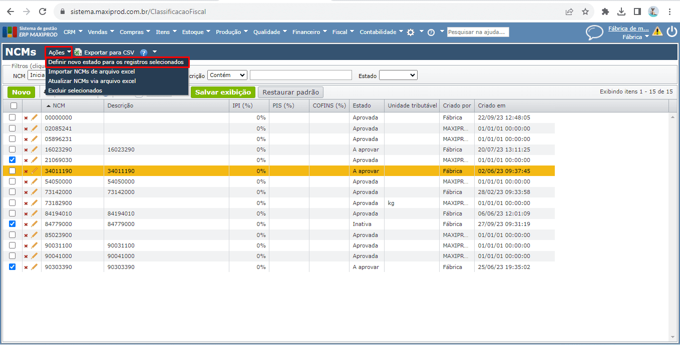 7) Para alterar o estado de mais de um cadastro de NCM ao mesmo tempo, basta marcar a caixa de seleção das linhas destes cadastros na grade, e ir em “Ações > Definir novo estado para os registros selecionados”.
