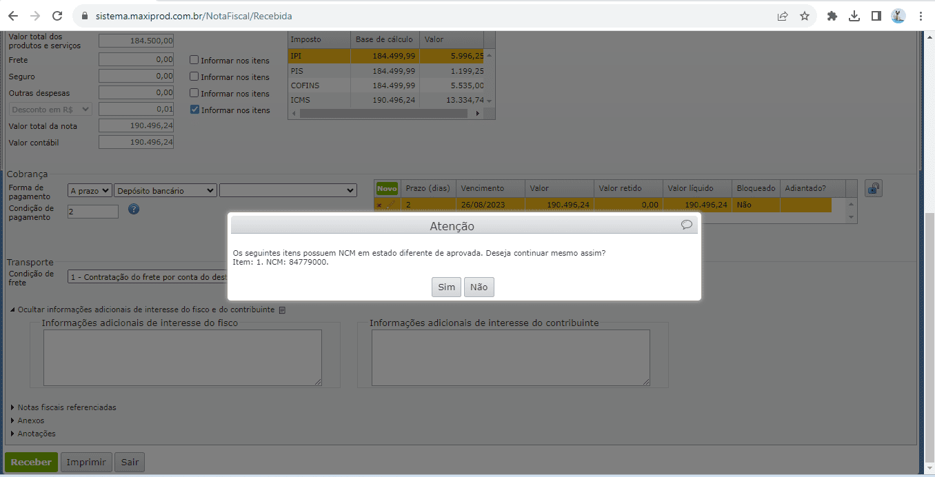 Essa mensagem é apresentada no momento em que o usuário está emitindo ou recebendo nota fiscal no ERP MAXIPROD, e há itens da nota fiscal que possuem NCM cujo cadastro encontra-se em estado “A aprovar” ou “Inativo”. A NCM (Nomenclatura Comum do Mercosul) é uma classificação fiscal das mercadorias. Toda mercadoria importada ou comprada no Brasil deve ter um código NCM na sua documentação legal (nota fiscal, livros legais, etc.).