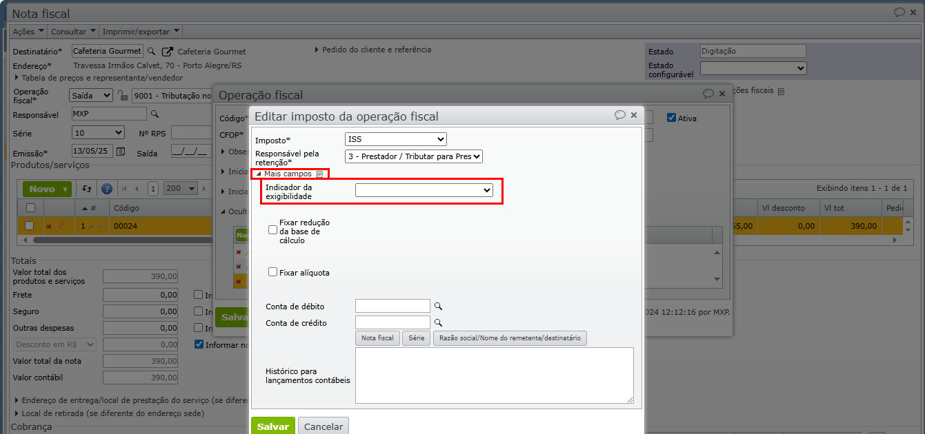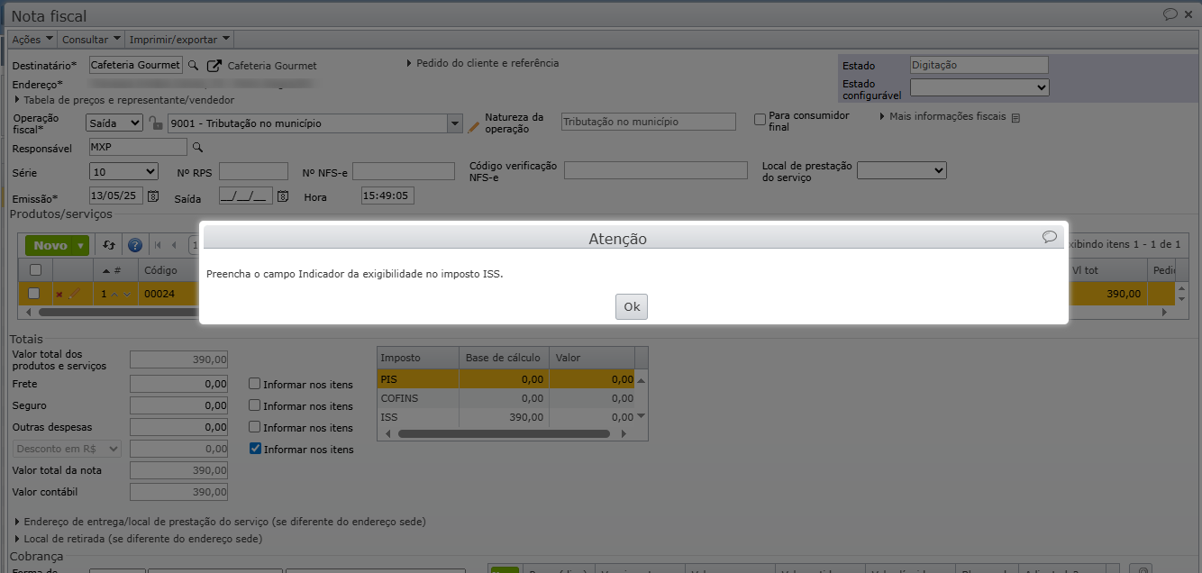 Para prosseguir com a emissão, é necessário preencher o campo “Indicador da exigibilidade”, informado na configuração do imposto ISS. A correção pode ser feita na operação fiscal utilizada na NF de serviço.