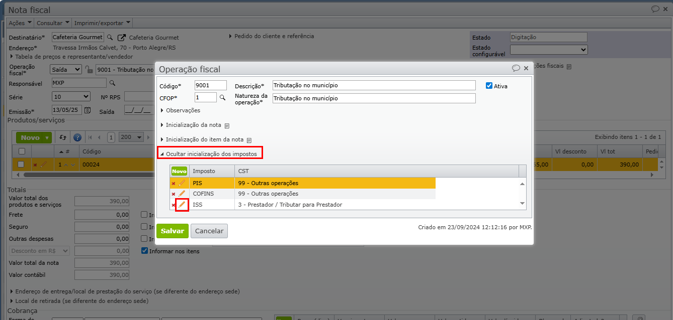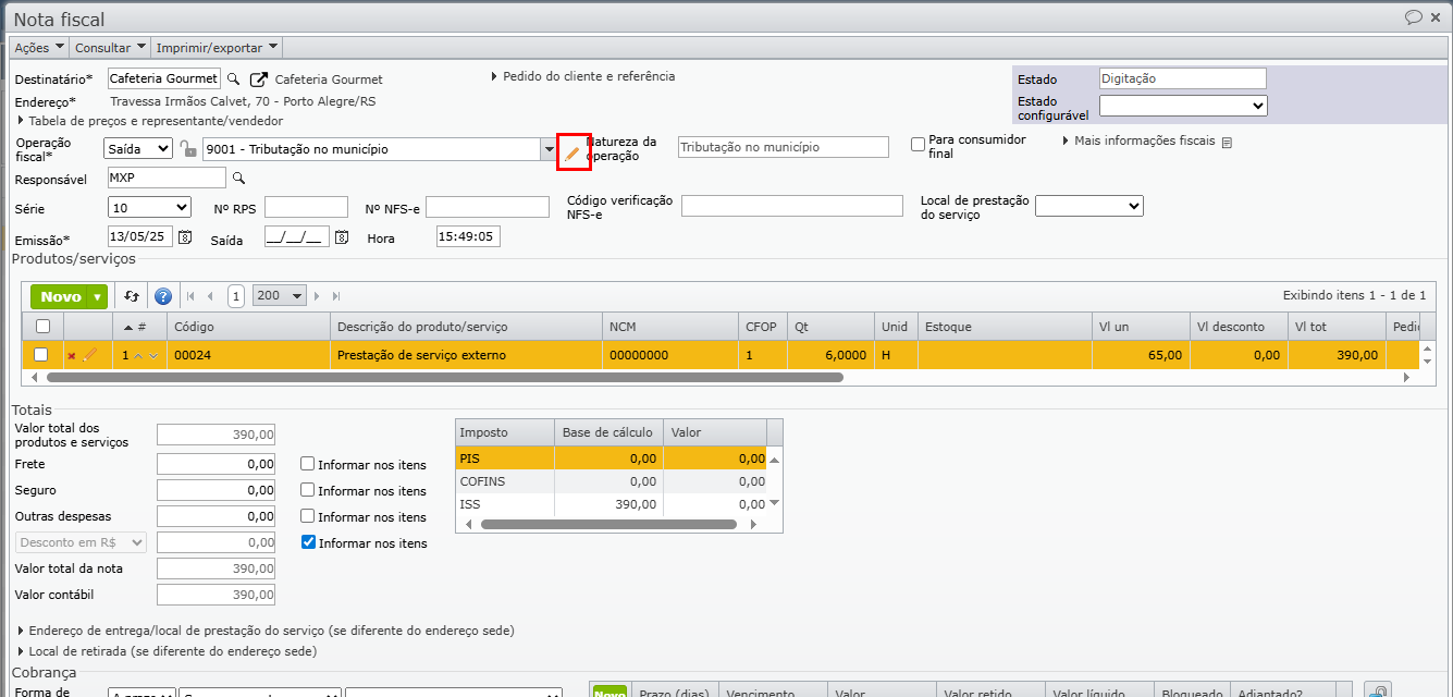 1) Com a NF de serviço aberta e em estado de “Digitação”, clique no ícone do lápis para editar a operação fiscal.
