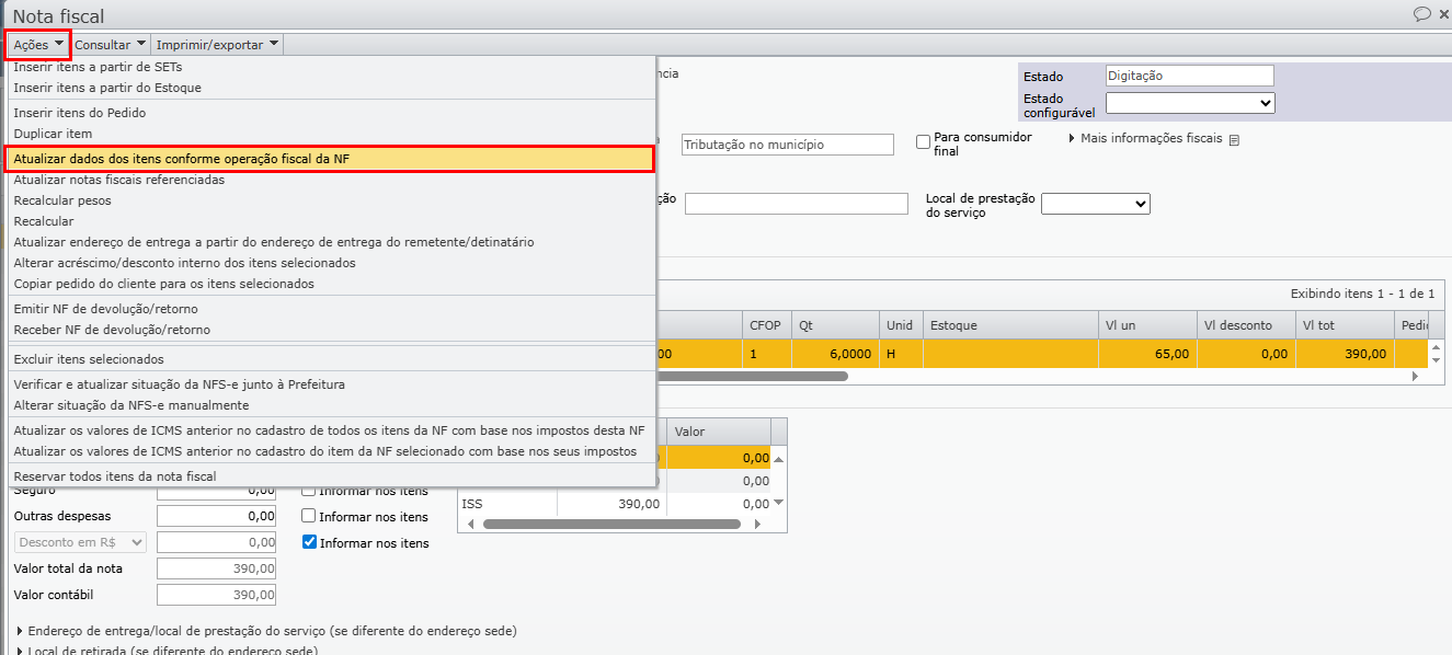 5) A seguir, volte para a tela de edição da NF de serviço e selecione a opção “Ações > Atualizar dados dos itens conforme operação fiscal da NF”.