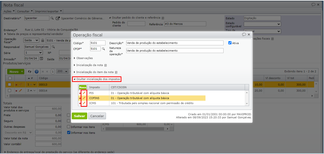 2) Na tela de edição da operação fiscal, expanda a seção “Inicialização dos impostos”, e clique no ícone do lápis para editar o imposto.